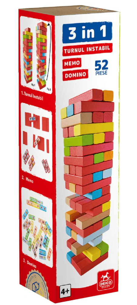 Include 3 jocuri intr-un singur set: Turnul Instabil, Memo si Domino.