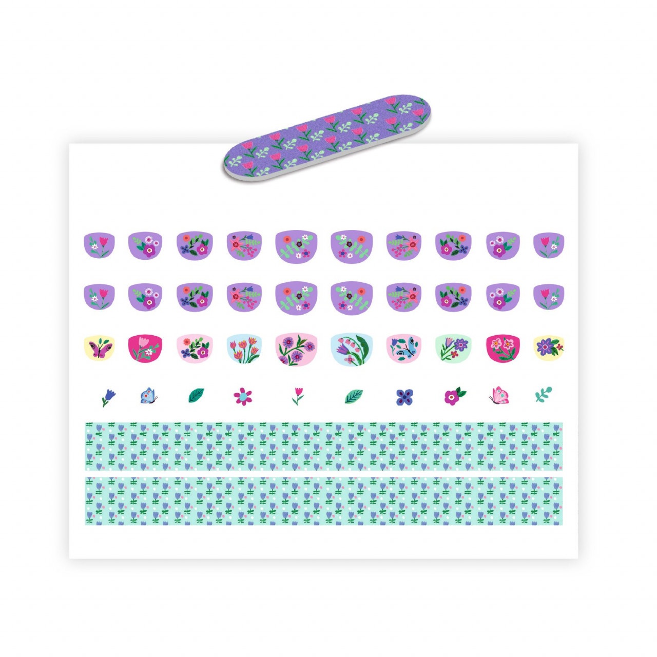 Stickere pentru unghii model flori Manichiura super-rapidă pentru cei mici, ușor de aplicat și de dat jos! De la cel mai mic abțibild pentru degetul mic până la cel mai mare pentru degetul mare: lipiți, apăsați, gata! Nu e nevoie de ojă - doar bucuria de a-ți decora unghiile cu ilustrații frumoase! Iar pentru a schimba modelele sau pentru a crea propriul model, tăiați o bucată din banda adezivă la dimensiunea lățimii unghiei. Fără lac de unghii Două pile de unghii incluse pentru un finisaj personalizat Fără dizolvant Rezistente la apă O bandă cu modele de decupat pentru a se potrivi tuturor mărimilor de unghii 120 de autocolante! Utilizare medie: o dată pe săptămână Conține 90 autocolante pentru unghii + 30 autocolante mai mici + 6 benzi de modele de decupat + 2 pile de unghii Vârsta recomandată: 4-8 ani. Set fabricat din hârtie și carton certificate FSC®. AVERTISMENT: Contraindicat copiilor sub 3 ani. A se utiliza sub directa supraveghere a unei persoane adulte. Producator: Djeco