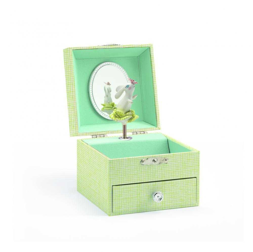Cutie muzicala Iepuraș Cutie muzicală cu sertar pentru a păstra bijuterii și obiecte secrete. Întoarceți cheița, deschideți cutia și ea prinde viață: un iepuraș sculptat delicat se rotește, reflectat într-o oglindă ovală. Melodie: Let My Call You Sweetheart. Compozitor: Leo Friedman. Melodia durează aproximativ 2 mim 30 sec. Conținut: cutie muzicală de bijuterii cu sertar, căptușită la interior cu catifea. Dimensiune cutie muzicală: 10,5 x 10,5 x 8,5 cm. Vârsta recomandată: +4 ani Confecționată din lemn, carton, textil și metal. Certificat FSC®. AVERTISMENT: Acest articol nu este jucărie. A nu se lăsa la îndemâna copiilor sub 3 ani. Design: Elodie Nouhen Producător: Djeco, Franța.