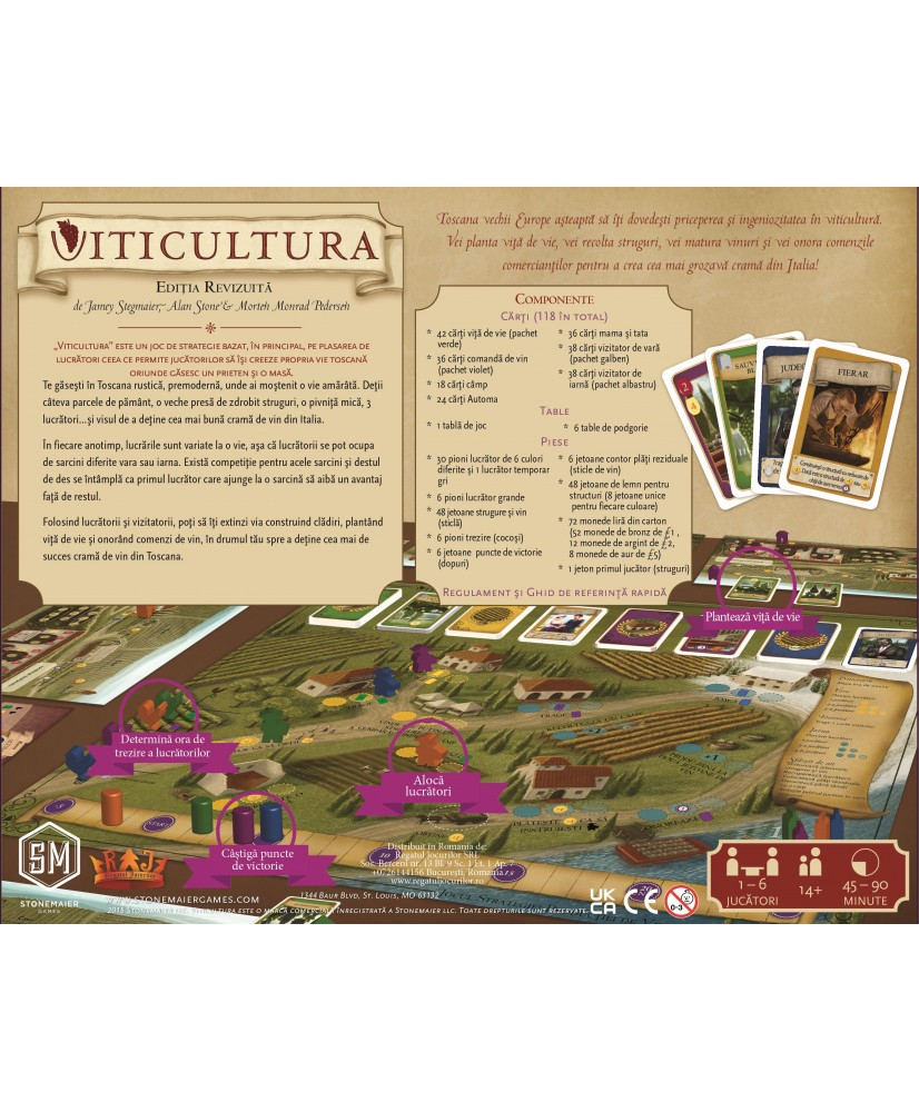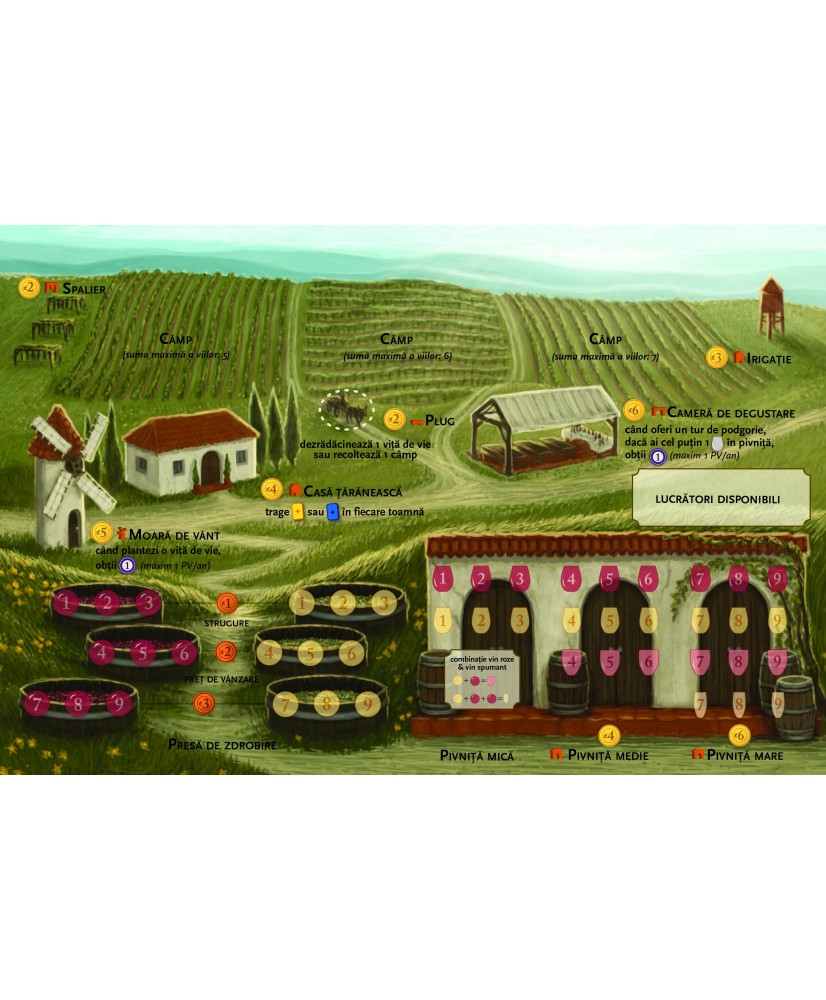 Viticulture - Essential Edition include componete pentru Viticultura precum 36 de carti Mama & Papa, carti Field (proprietati), vizitatori si 24 Automa cards si cateva reguli noi.