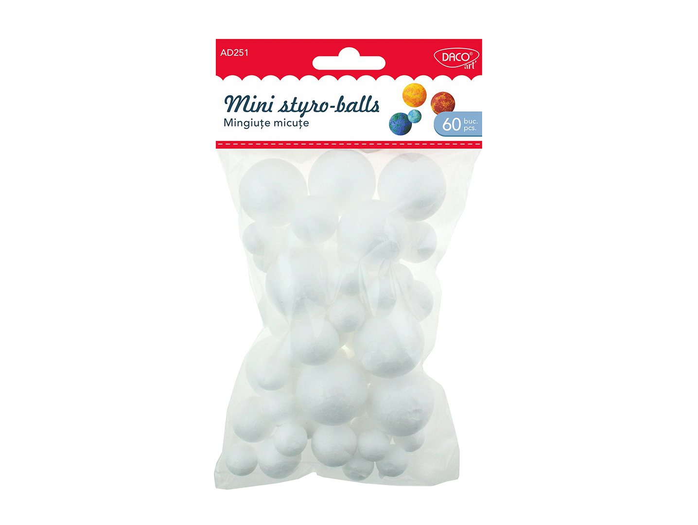Da frau liber imaginatiei cu Set 60 Mingiute Polistiren DACOart AD251! Aceste accesorii versatile sunt perfecte pentru proiecte handmade, ornamente de sarbatori si decoratiuni unice, usor de personalizat in functie de stilul tau.