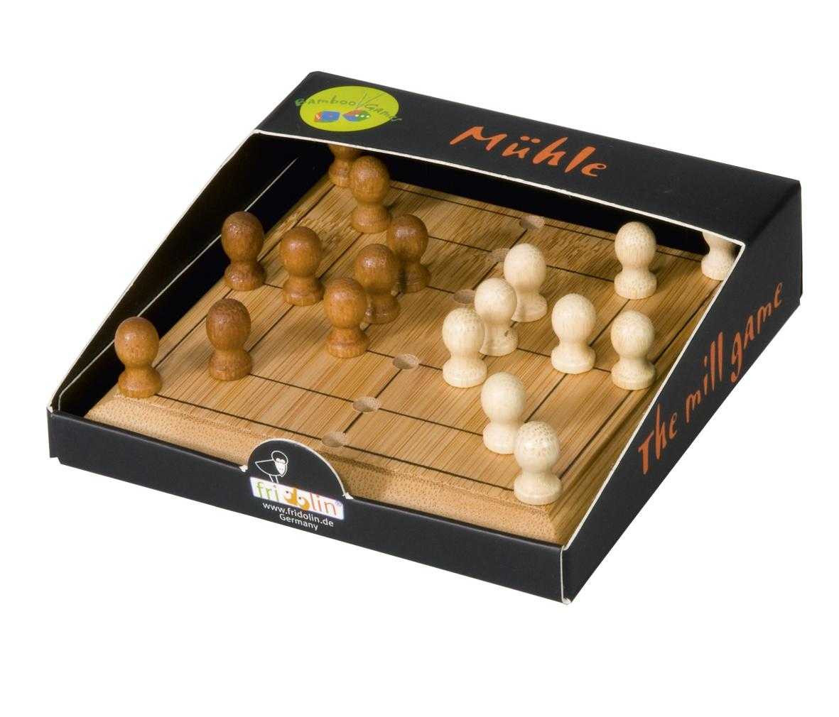 Joc de societate Moara Un joc clasic pentru toată familia. Reguli de joc: la începulul partidei tabla de joc este goală. Jocul se desfășoară în doua etape. In prima etapă jucătorii pun rând pe rând câte una toate piesele proprii pe punctele de pe tabla de joc. In cea de-a doua etapă jucătorii mută rând pe rând piesele proprii cu scopul să realizeze cât mai multe mori. Când un jucător realizează o moară, are dreptul să elimine o piesă a adversarului. Mutarea unei piese se face numai de-a lungul uneia dintre liniile trasate pe tabla de joc și doar într-un punct învecinat. Când un jucător realizează un șir de trei piese proprii de-a lungul uneia dintre liniile tablei a realizat o moară. Piesa aleasă pentru eliminare trebuie să nu facă parte dintr-o moară. Dacă un jucător închide două mori simultan , poate elimina două piese ale adversarului. Câștigă jucătorul care a eliminat cele mai multe piese ale adversarului. Vârsta recomadată: +6 ani. Confecționat din lemn și materiale non-toxice, cu vopsele non-toxice conform reglementărilor EN71&ASTM. Certificare FSC. AVERTISMENT: Contraindicat copiilor mai mici de 3 ani. Conține piese mici. Pericol de sufocare. A se utiliza sub directa supraveghere a unei persoane adulte. Producător: Fridolin, Germania. Moara - descarca aici regulile jocului