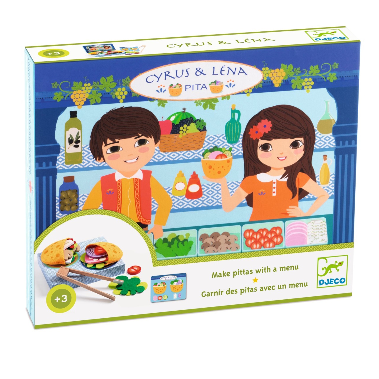 Meniul mediteranean Cyrus și Lena Cele mai gustoase preparate. Prepară după meniu un sandwich delicios cu ingrediente meditareneene, din lemn și fetru. Un joc de rol pentru ca cei mici să se distreze la fel de mult ca și adulții. Când este răsturnată, cutia se transformă într-o tavă de servire. Toate accesoriile sunt depozitate în cutie. Conține 2 pita de umplut și 9 ingrediente din pâslă (4 salate verde, 1 șuncă, 1 ketchup, 1 maioneză, 2 pita), 8 ingrediente din lemn (felie de - roșie, ceapa, castravete, ciupercă, brânză) un clește, un meniu și o cutie de lemn. Vârsta recomandată: +3 ani. Confecționat din materiale și vopsele non toxice conform reglementărilor EN71&ASTM. Certificare FSC. AVERTISMENT: Contraindicat copiilor sub 3 ani. A se folosi sub directa supraveghere a unei persoane adulte. Producător: Djeco , Franța.