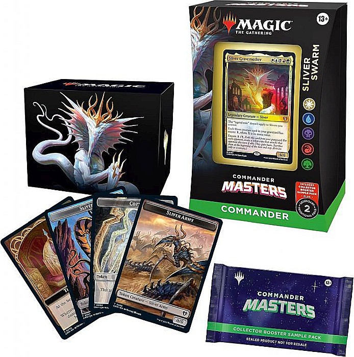 Magic: The Gathering Commander Masters Commander 4 Deck: 1 Eldrazi Unbound (Colorless Deck), 1 Enduring Enchantments (White-Black-Green Deck), 1 Planeswalker Party (Blue-Red-White Deck) si 1 Sliver Swarm (White-Blue-Black-Red-Green Deck).
