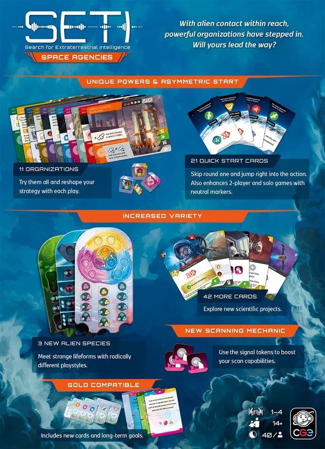 Aceasta adaugire pentru jocul strategic SETI: Search for Extraterrestrial Intelligence introduce organizatii asimetrice, fiecare cu abilitati speciale, avantaje strategice si conditii de start diferite – oferindu-ti o experienta de joc complet noua in cautarea vietii extraterestre.