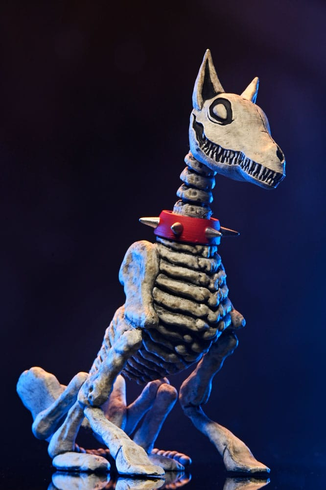 🐶 Poppet, companionul ei de dincolo de mormânt, este inclus în pachet ca accesoriu complet sculptat, cu detalii impresionante — o coloană vertebrală articulată, o expresie caricaturală și o zgardă roșie cu ținte aurii care accentuează stilul punk al universului Beauty of Horror.