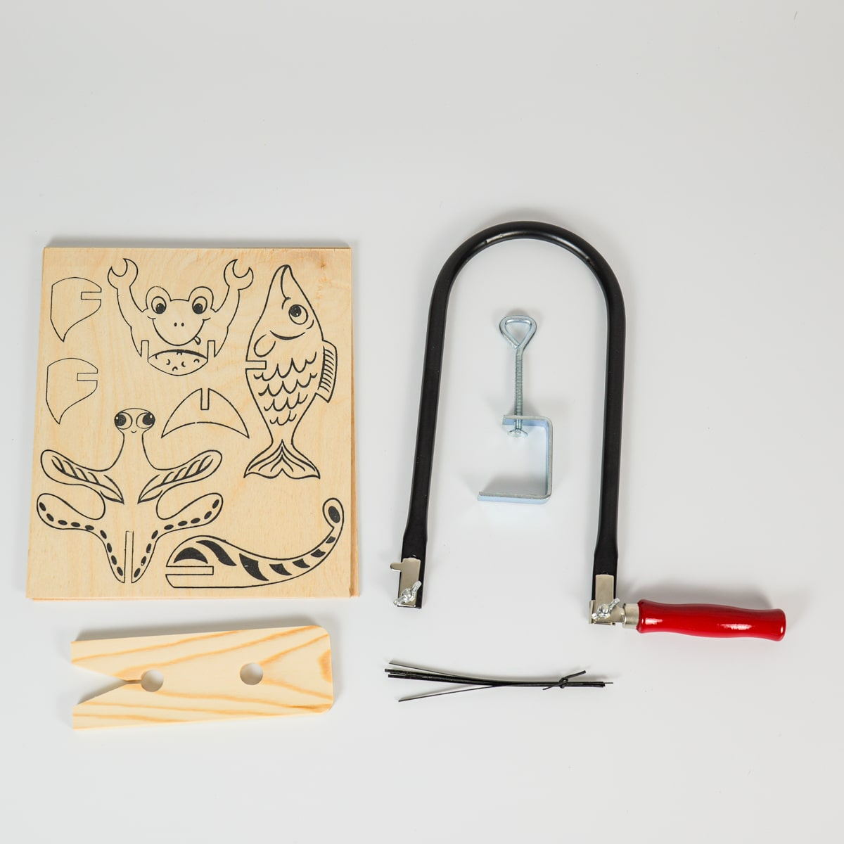 Include fierastrau traforaj ergonomic, 5 paze, suport de taiere, clema, modele imprimate cu animale acvatice si placaj neimprimat