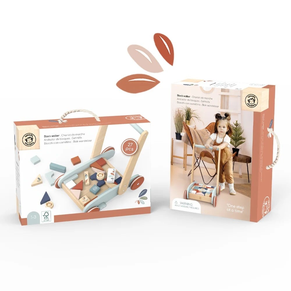 Carucior cu cuburi, Speedy Monkey Cărucior din lemn FSC pentru primii pași ai copilului, echipat cu 27 de cuburi de forme și culori diferite. Oferă sprijin și stabilitate copilului care deprinde arta mersului. Cele 27 de blocuri colorate incluse servesc nu doar ca greutate pentru cărucior, dar și pentru jocuri creative de stivuire și construcție. Întreg designul a fost gândit pentru siguranță, incluzând un sistem de frână ce împiedică deplasarea accidentală a roților atunci când copilul nu este încă stabil pe picioare. Caracteristici: Joacă creativă: Cuburile pot fi folosite pentru construcții individuale Se transformă rapid din premergător în jucărie de plimbat pe roți Roți silențioase, acoperite cu cauciuc pentru siguranță și confort pe orice suprafață Spațiu de depozitare pentru jucăriile preferate Mâner ergonomic pentru control ușor Lemn certificat FSC®, vopsele pe bază de apă, 100% sigure pentru copii Ușor de curățat: se șterge cu o cârpă umedă Recomandat pentru: dezvoltarea echilibrului și exersarea mersului pentru cadouri de botez, aniversări, pentru copilul care începe să exploreze lumea pașilor independenți. Copii peste 12 luni Dimensiuni carucior asamblat : 34.9 x 24.9 x 40 cm 🌱 Realizat din lemn certificat FSC AVERTISMENT: Contraindicat copiilor sub 12 luni. Se recomandă supravegherea copilului în timpul jocului. Producător: Speedy Monkey