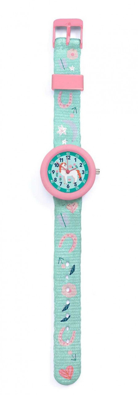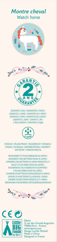 Ceas de mână Pasiune pentru cai Ziua în care copilul primește primul ceas este una memorabilă! Este împlinirea dorinței lui de a ”fi mare”. Un ceas elegant cu cuarț frumos ilustrat cu un calut, pentru a învăța să citească ora. Un ceas educativ cu două cadrane distincte (unul pentru ore, celălalt pentru minute) și limbi fine pentru a facilita citirea orei. Datorită mișcării japoneze Miyota 2035, mecanismul este silențios. Un ceas cu o carcasă rezistentă la șocuri și rezistență la apă până la 3 bar. Funcționează cu o baterie SR626SW (inclusă). Rezistent la apă până la 3 ATM. Mecanism și baterie fabricate în Japonia. 2 ani garanție. Ceasul vine ambalat într-o cutie decorativă. Funcționează cu baterie, care este inclusă în set. Vârsta recomandată: +3 ani. AVERTISMENT: Contraindicat copiilor sub 3 ani. Conține piese ce pot fi înghițite. A se utiliza sub directa supraveghere a unei persoane adulte. Producător: Djeco, Franța.