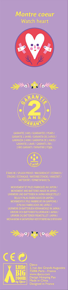 Ceas de mână Ritmul inimii Ziua în care copilul primește primul ceas este una memorabilă! Este împlinirea dorinței lui de a ”fi mare”. Un ceas elegant cu cuarț frumos ilustrat cu o inimă, pentru a învăța să citească ora. Un ceas educativ cu două cadrane distincte (unul pentru ore, celălalt pentru minute) și limbi fine pentru a facilita citirea orei. Datorită mișcării japoneze Miyota 2035, mecanismului este silențios. Un ceas cu o carcasă rezistentă la șocuri și rezistență la apă până la 3 bar. Funcționează cu o baterie SR626SW (inclusă). Rezistent la apă până la 3 ATM. Mecanism și baterie fabricate în Japonia. 2 ani garanție. Ceasul vine ambalat într-o cutie decorativă. Funcționează cu baterie, care este inclusă în set. Vârsta recomandată: + 3 ani. AVERTISMENT: Contraindicat copiilor sub 3 ani. Conține piese ce pot fi înghițite. A se utiliza sub directa supraveghere a unei persoane adulte. Producător: Djeco, Franța.