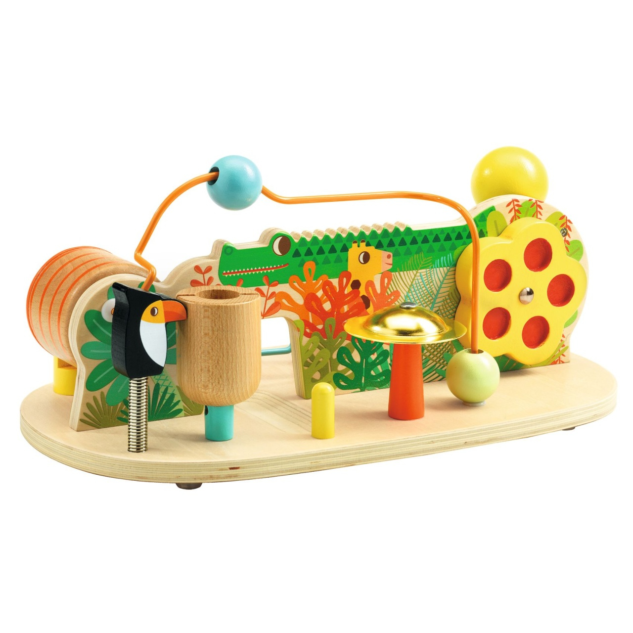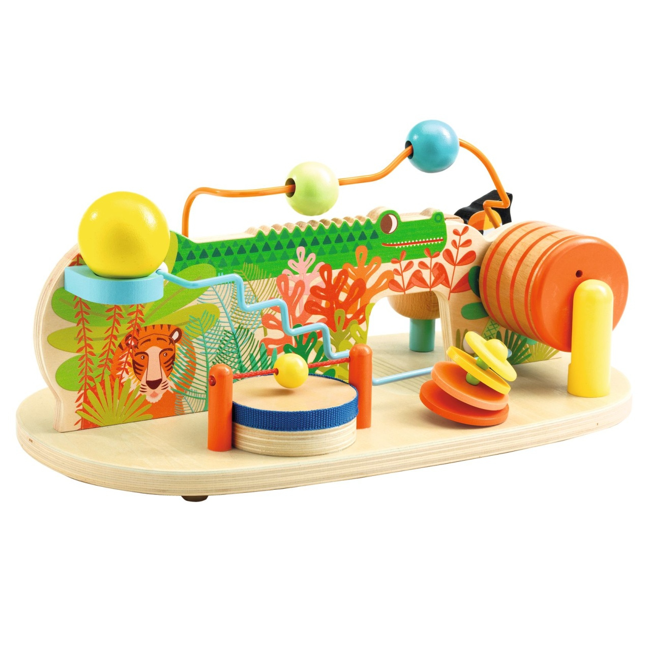 Centru de activitati cu multi sunete Multi Sound este o jucărie cu 8 activități sonore, rezistentă la șocuri. Copilul se mișcă în jurul ei pentru a se juca și a descoperi cele 8 sunete diferite care provin de la: papagalul elastic pe un cilindru de lemn, roata care se învârte, bila de-a lungul spatelui crocodilului, cilindrul rotativ, bila care cade pe ținbal la sfârșitul cursei, bila de pe elastic care atinge tamburina, bila mare care coboară pe toboganul de metal și discurile care se ciocnesc. Opt activități sonore în jurul crocodilului. Conținut: o bază asamblată din lemn cu o bilă din lemn. Dimensiune jucărie: 35 x 14 x 20,5 cm. Confecționat din lemn si metal. Conform reglementărilor EN71&ASTM. Vârsta recomandată: +18 luni. AVERTISMENT: Contraindicat copiilor sub 18 luni. A se utiliza sub directa supraveghere a unui adult. Producător: Djeco, Franța.