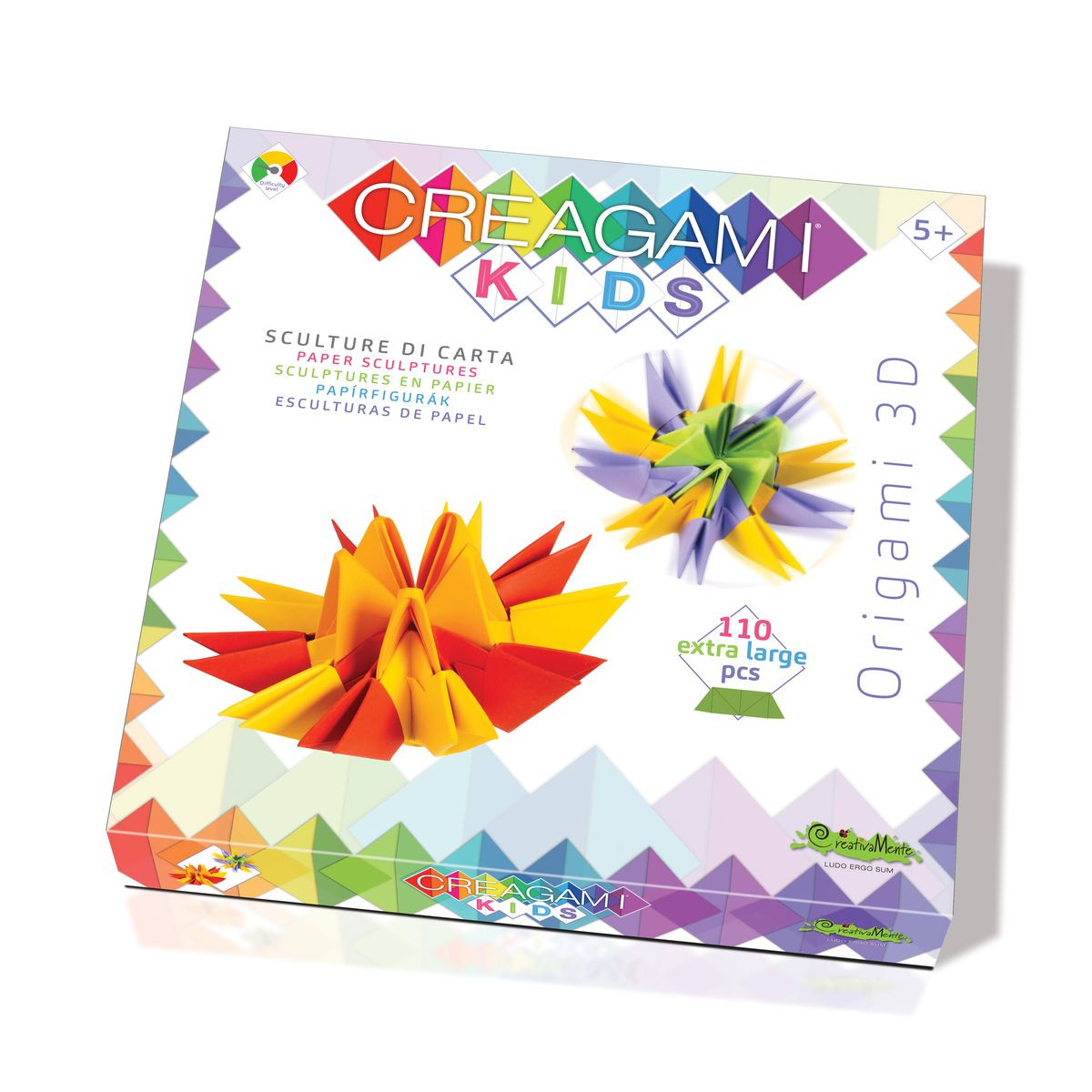 Origami 3D. Creează o adevărată sculptură în relief, cu ajutorul bucățelelor de hârtie pe care le îndoi precum la origami, și apoi le asamblezi modular pentru a realiza titirezi inediți. Dezvoltă manualitatea, concentrarea și relaxează în același timp. Vârsta recomandată: +3 ani. Fiecare produs are QR code, care vă încarcă video cu instrucțiuni și moduri de îmbinare a pieselor. AVERTISMENT: Contraindicat copiilor sub 3 ani, conține piese mici, pericol de sufocare. A se utiliza sub directa supraveghere a unui adult. Producător: CreativaMente, Italia