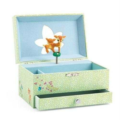 Cutie muzicala Căprioara Cutie muzicală cu sertar pentru a păstra bijuterii și obiecte secrete. Întoarce cheița, deschide cutia și vei fi surprins și o căprioară sculptată delicat se va roti, reflectată într-o oglindă frunză. Melodie: Povestiri din pădurea vieneză. Compozitor: Johann Strauss. Melodia durează apx 2 min 30 sec. Conținut: o cutie muzicală și de bijuterii, din lemn, acoperită cu hârtie, căptușită cu catifea, 1 sertar. Dimensiune cutie muzicală: 17,8 x 11,3 x 9,9 cm. Vârsta recomandată: +4 ani. Confecționată din lemn, carton, textil și metal. Certificare FSC®. AVERTISMENT: Acest articol nu este jucărie. Nu lăsați la îndemăna copiilor sub 3 ani. A se utiliza sub directa supraveghere a unei persoane adulte. Design: Caroline Faup Producător: Djeco, Franța.