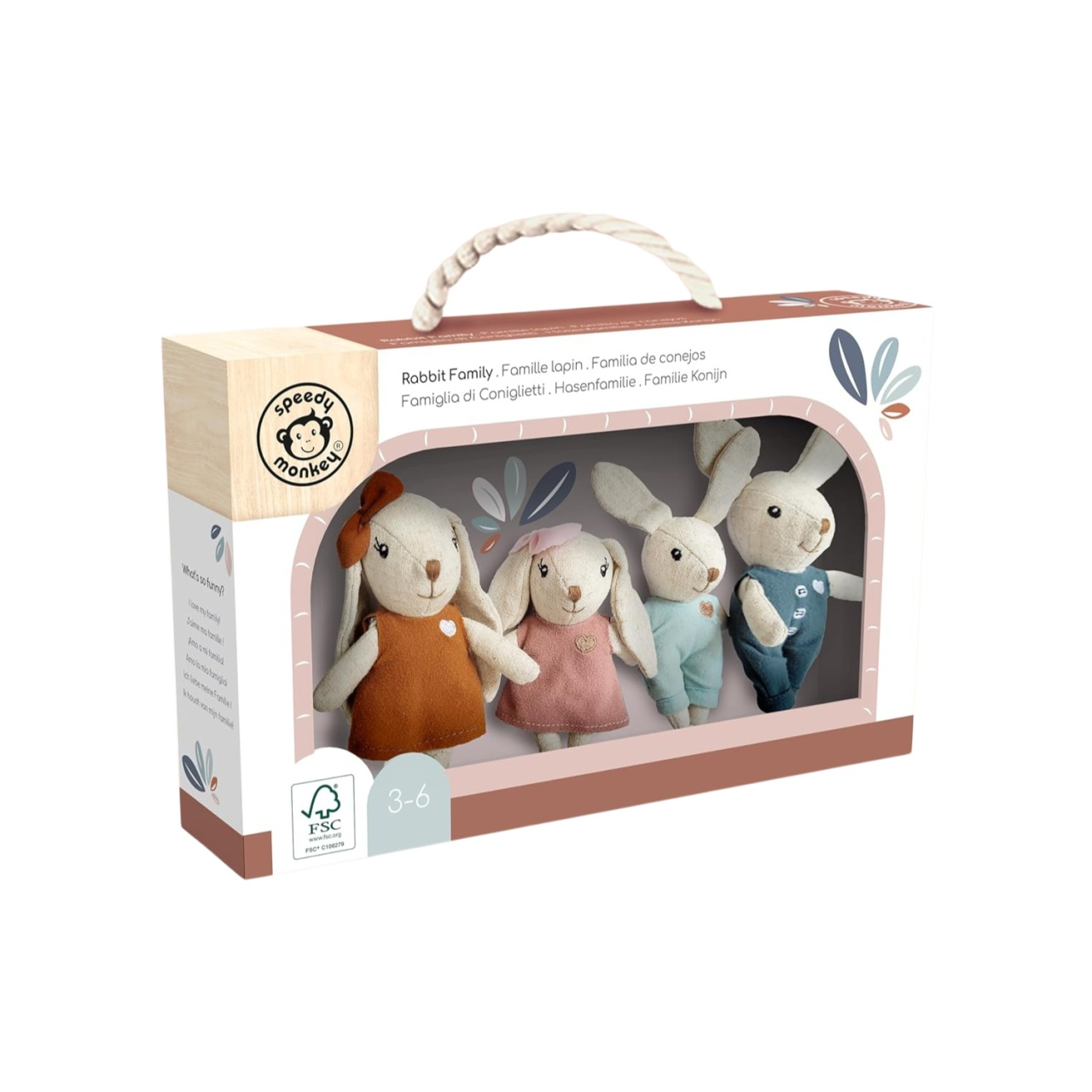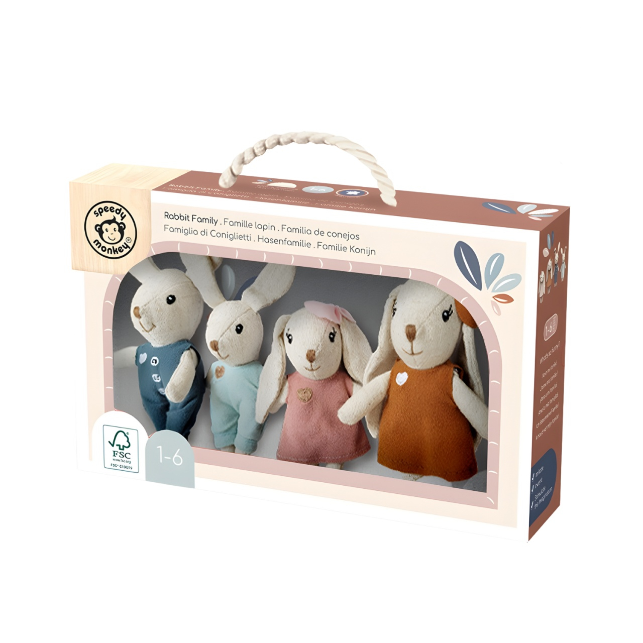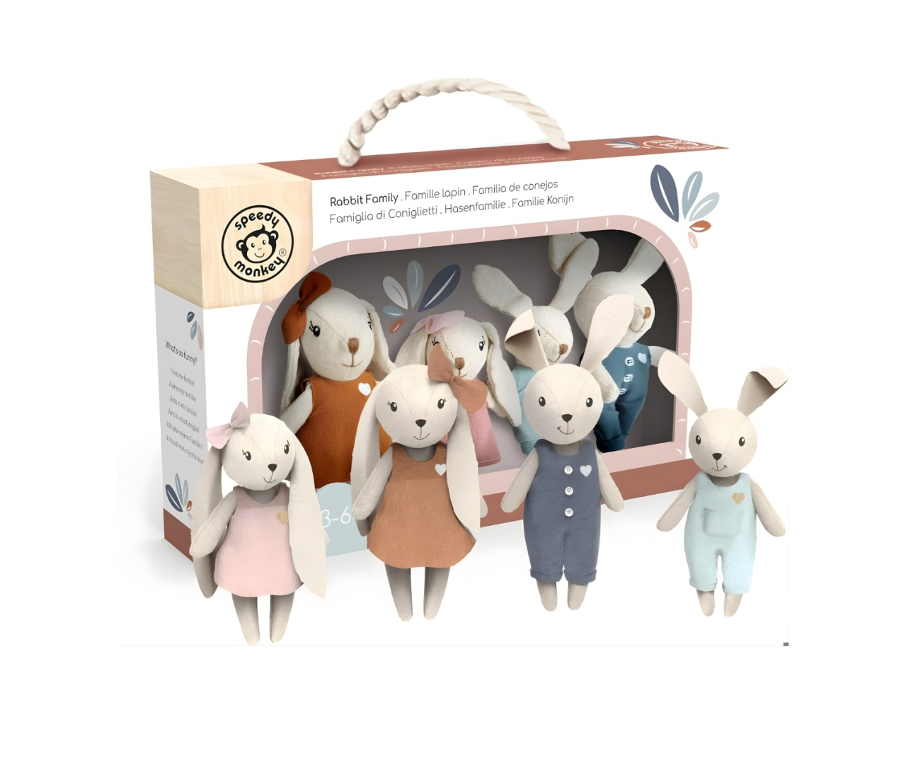Familia de iepurași care aduce poveștile la viață! Personajele familiei de iepurași își fac loc ușor în universul copilului. Formată din patru figurine articulate din in, această familie de iepurași multicolori invită la jocuri imaginative, povești creative și explorări senzoriale. Potrivit pentru o gamă mare de vârste, setul încurajează empatia și interacțiunea. Caracteristici Stimulează creativitatea, imaginația și jocurile de rol Încurajează empatia, colaborarea și narațiunea Ideal pentru coordonarea mână‑ochi și motricitate fină prin manipularea figurilor Dimensiuni personaje: Iepuraș adult: Lungime ≈ 12 cm Iepuraș copil: Lungime ≈ 9 cm Vârsta recomandată: +12 luni. Confecționat din textil (in) – figuri moi, detalii atent lucrate. AVERTISMENT: Contraindicat copiilor sub 12 luni. A se folosi sub directa supraveghere a unei persoane adulte. Producător: Speedy Monkey