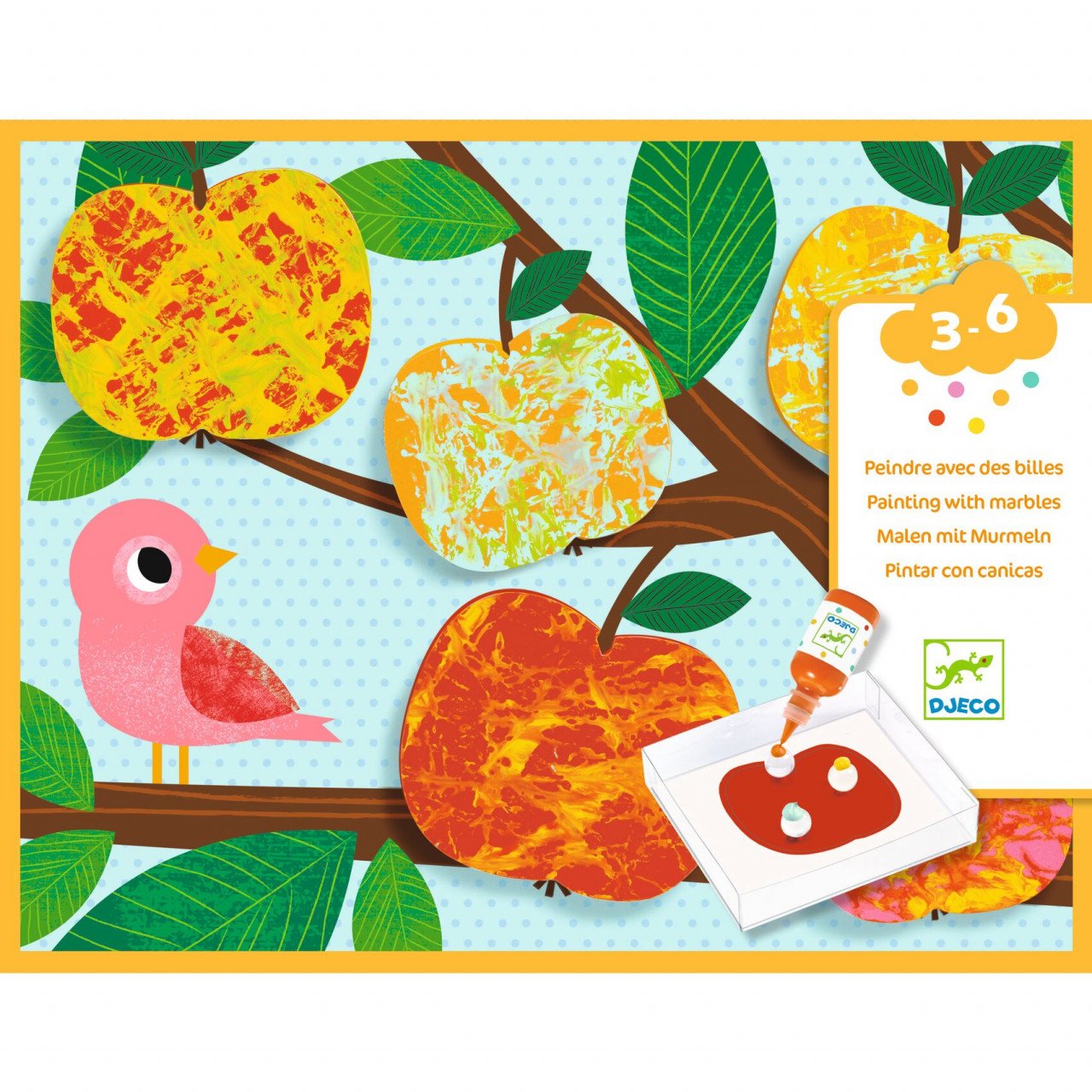 Pictură cu bile din sticlă Natura O activitate creativă inedită, cu un rezultat estetic neașteptat. Copiii pun formele în cutie, apoi adaugă bilele și stropi mari de vopsea deasupra. Închid cutia și o scutură puternic. Când deschid... surpriză! Formele sunt acoperite de culori. Tot ce mai rămâne de făcut este să le lipiți pe desenele ilustrate. Un kit de pictat fără a face mizerie: totul se întâmplă în cutie, mâinile rămân curate. Este distractiv să agiți puternic cutia și să privești cum vopseaua lasă urme pe forme. Un efect magic care este diferit de fiecare dată. Conținut: 4 modele ilustrate de finalizat (28 x 21 cm), 21 de forme de pictat, 4 tuburi cu vopsele pentru degete (portocaliu, galben, verde intens și verde măr), cutie de plastic care conține 3 bile de sticlă, bandă dublu-adezivă și broșură cu instrucțiuni pas cu pas. Vârsta recomandată: 3-6 ani. AVERTISMENT: Contraindicat copiilor sub 3 ani, conține piese mici, pericol de sufocare. A se folosi sub directa supraveghere a unei persoane adulte. Producător: Djeco, Franța .