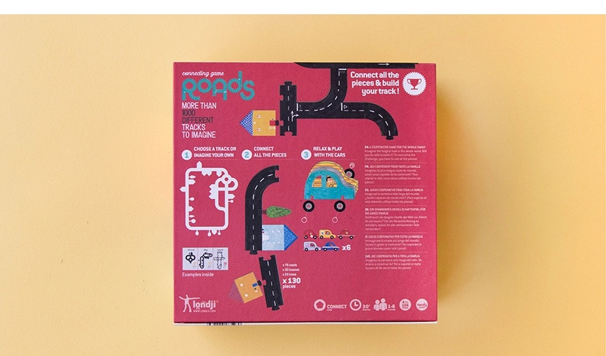Joc de cooperare Șosele Un joc de cooperare pentru întreaga familie. Construiți împreună cel mai lung traseu folosind toate piesele șosea, iar apoi... liber la jocă - mașinile pot circula oricum doresc șoferii. Puteți alege un nivel mai ușor, pentru relaxare alături de cei mici. Regulile sunt simple, referindu-se la alăturarea pieselor pentru a crea diferite trasee. Piesele șosea se pot îmbina pentu a crea circuite de diferite grade de dificultate - de la ușor la dificil, liber sau după modelul celor incluse în broșura cu imagini din interior. Sunt indicate piesele necesare: soșele, clădiri, arbori, intersecții, capetele de traseu. Posibilitățile sunt nenumărate atunci când jucătorii vor să găsească alte variante de circuite. Peste 1000 de variante de trasee posibile. Conține 130 de piese după cum urmează: 76 sosea, 30 clădiri, 24 arbori. Vârsta recomandată: 4-104 ani. Confecționat din hârtie FSC și carton reciclat. Conform reglementarilor EN71&ASTM. AVERTISMENT: Contraindicat copiilor sub 3 ani. Se recomandă supravegherea copilului de către un adult în timpul jocului. Producător: Londji, Spania. Ilustrat de Can Seixanta FG014U Joc de cooperare sosele - descarca aici regulile jocului