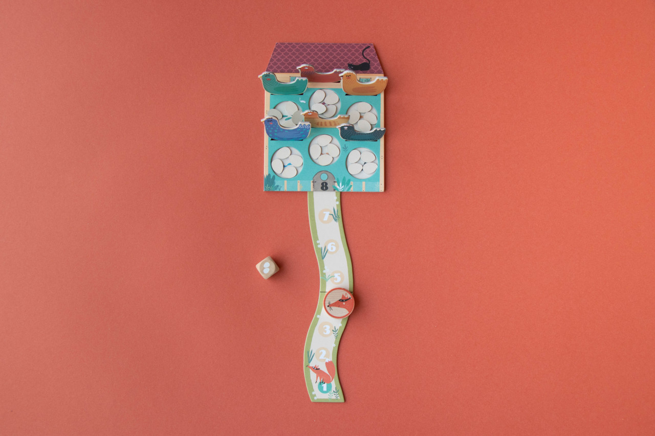 Joc de cooperare Cluck, cluck the fox, varianta de buzunar Salvează ouăle și găinile din ghearele vulpii! Norocul zarurilor va decide dacă putem salva un ou, două ouă, una dintre găini sau, pe de altă parte, trebuie să mutăm vulpea de-a lungul drumului. Va trebui să luăm cea mai bună decizie pentru a ne atinge scopul. Un prim joc de societate în format de călătorie, pentru a lua peste tot și a ne familiariza cu numerele și dinamica jocurilor cooperative. Un joc de societate cooperativ pentru copii de la 4 ani în care va trebui să lucrăm în echipă pentru a ne atinge obiectivul. În format de buzunar, pentru a-l lua cu tine în călătorii. Pentru 2-8 jucători. Vârsta recomandată: 4-8 ani. Confecționate din Hârtie FSC și carton reciclat. Conform reglementarilor EN71&ASTM. Producător: Londji, Spania. Un joc sustenabil fabricat în Europa.