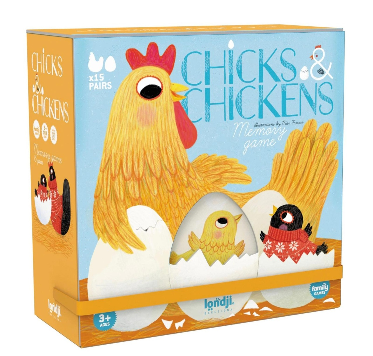 Joc de Memorie – Gaini cu pui 🐥🐔 Un joc de memorie captivant pentru întreaga familie! În cotețul Londji, găinile își caută puii proaspăt ieșiți din ou. Poți să le ajuți să-i găsească? Formează cât mai multe perechi de găini și pui pentru a câștiga jocul! 🔹 Stimulează memoria și logica 🔹 Dezvoltă atenția, concentrarea și orientarea în spațiu 🔹 Îi învață pe cei mici să-și aștepte rândul și să ia decizii gândite 🎲 Cum se joacă? Un joc clasic de memorie, în care trebuie să găsești și să potrivești cele 15 perechi de găini și pui. Câștigă jucătorul care formează cele mai multe perechi! 🌱 Materiale ecologice & sigure pentru copii Fabricat din carton reciclat 📦 Conținutul cutiei: 30 de piese ilustrate delicat de Mar Ferrero Instrucțiuni disponibile în engleză, franceză, germană, italiană, spaniolă și catalană Dimensiuni compacte, ușor de luat în călătorii 📍 Fabricat cu grijă în Barcelona Avertisment! Nu este potrivit pentru copiii sub 3 ani. Conține piese mici. Produs de Londji