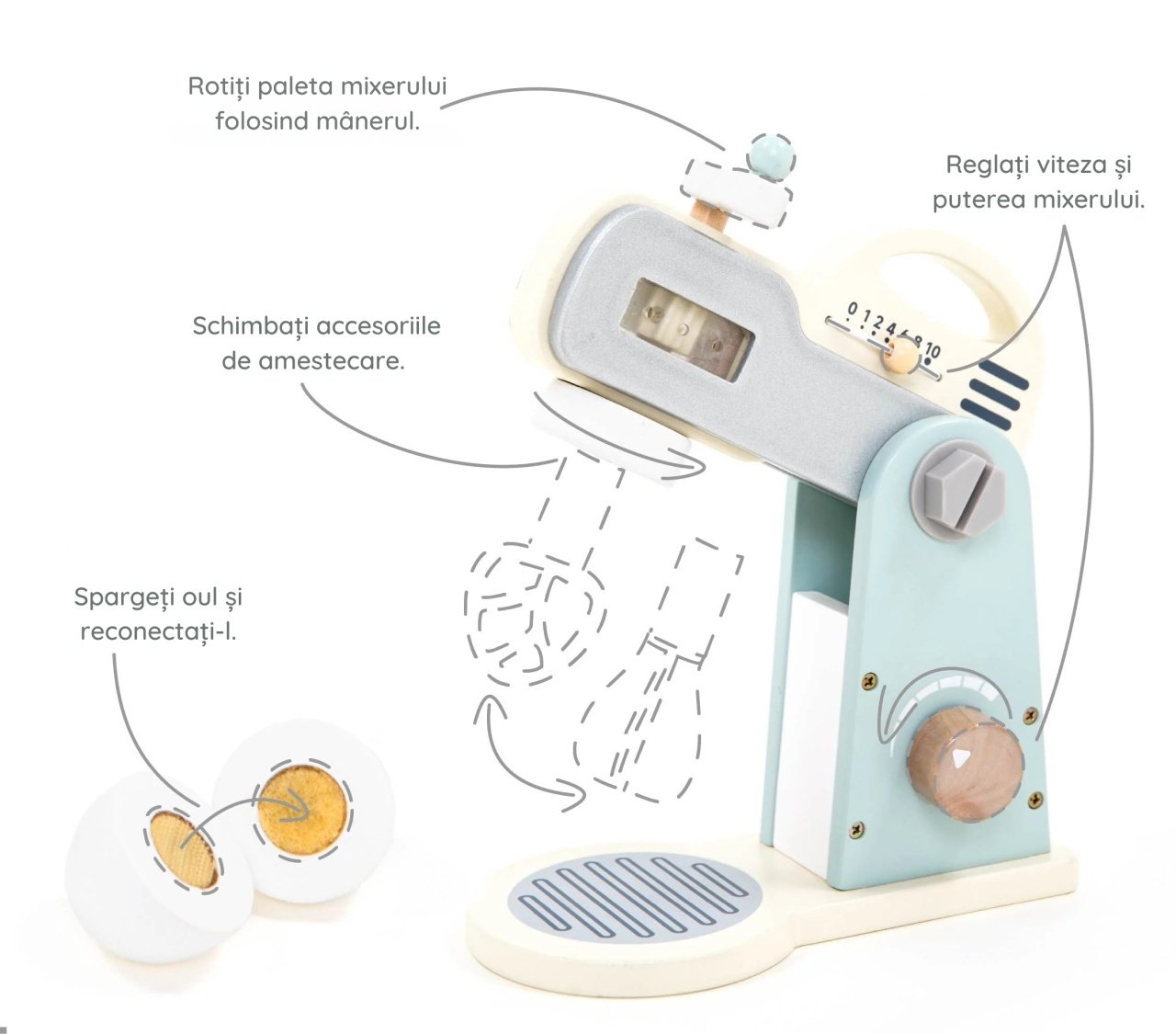 Joc de rol Mixer cu accesorii, UMU Toys Mixer din lemn pentru copii, cu design realist și accesorii pentru gătit. Rotirea butonului și schimbarea paletelor încurajează dezvoltarea abilităților motorii fine și coordonarea mână–ochi. Copiii se vor distra descoperind cum funcționează un mixer adevărat, învârtind aluatul imaginar cu precizie și entuziasm. Fiecare ingredient adaugă o doză de creativitate: făina, zahărul, ouăle și laptele îi ajută pe cei mici să se joace de-a cofetarii și să inventeze prăjituri și deserturi delicioase. Ce conține rețeta? Câte ouă punem? Lapte rece sau cald? Mixerul devine rapid piesa centrală din bucătăria copiilor. Jocul de rol cu ingrediente și ustensile este o ocazie excelentă de a învăța despre muncă în echipă, împărțirea sarcinilor și bucuria de a găti pentru cei dragi. Îi ajută pe copii să înțeleagă ce înseamnă grija, atenția și satisfacția de a dărui cuiva ceva „făcut de ei”. Ideal pentru jocuri individuale sau în familie, mixerul se potrivește perfect cu alte accesorii de bucătărie. Copiii pot „coace” prăjituri pentru o aniversare imaginară, pot pregăti micul dejun sau pot organiza o petrecere cu ceai și deserturi dulci. 🎁 Cadou ideal pentru zile de naștere, Crăciun, Paște sau Ziua Copilului. Setul conține 10 piese: mixer cu bol detașabil, două palete interschimbabile, două jumătăți de ou, cutie de lapte, saculeț cu făină, saculeț cu zahăr, biluțe de aluat din fetru. Toate piesele sunt solide, cu margini rotunjite și prietenoase cu cei mici. Vârsta recomandată: +3 ani 🌱 Confecționat din lemn cu vopsele ecologice pe bază de apă. Conform EN71 & ASTM, cu certificare CE AVERTISMENT: Contraindicat copiilor sub 3 ani. Se recomandă supravegherea copilului în timpul jocului. Produs în China pentru UMU Toys, Cehia.