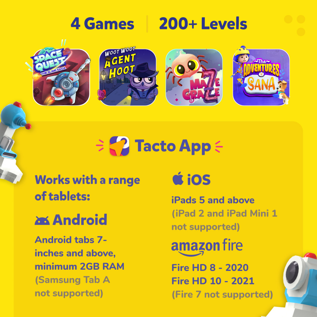 PlayShifu Tacto Laser, joc educativ puzzle STEM, cu Realitate Augmentată Jucării și cadouri educaționale pentru băieți și fete | Funcționează cu iPad-uri, tableta Samsung, Kindle Fire (Tableta nu este inclusă) Transformă-ți tableta într-o aventură STEM și explorează știința luminii cu Tacto Laser de la PlayShifu! Folosește figurine tactile pentru a rezolva puzzle-uri logice de pe ecran. Timp de joacă ce dezvoltă abilități pentru viață - rezolvarea creativă a problemelor, raționament logic și multe altele! Rezolvă mistere palpitante „luminând” indiciile! Alege strategic figurina pentru a traversa obstacolele. Folosește figurina lanterna și figurina oglindă pentru a lumina ținta. Împarte lumina în 7 culori cu figurina prismă și folosește o culoare pentru a rezolva puzzle-uri. Tacto Laser are 4 jocuri diferite bazate pe povești, cu peste 200 de provocări care devin din ce în ce mai dificile. Jocurile sunt pline de imagini bogate, animații, personaje și povestiri pentru a ajuta copiii să-și dezvolte abilitățile STEAM. Conține: 2 rame și 4 piese de joc (figurină oglindă, figurină prismă, figurină lanternă, figurină laser). Atașați cele 2 rame anti-alunecare pe părțile laterale ale tabletei. Descarcă aplicația gratuită Tacto din App Store sau Play Store pe dispozitivul tău. Conectarea la internet este necesară doar pentru instalarea și actualizarea aplicatiei. DISPOZITIVE COMPATIBILE: iPad 5 și mai sus (iPad 2 și iPad Mini 1 nu sunt acceptate); Android 7 inchi și mai sus, minim 2 GB RAM (Samsung Tab A nu este acceptat); Amazon Fire 8 -b Versiunea 2018 și 2020, versiunea Fire 10 - 2021 (Fire 7 nu este acceptat). Aplicatia nu este disponibila in limba romana. Vârst ă recomandată : +5 ani. Alimentăm mințile tinere cu jucării tehnologice interactive și educaționale creând experiențe educaționale de joacă pentru copiii de astăzi, astfel încât aceștia să poată revoluționa lumea de mâine. Confecționat conform reglementărilor EN71&ASTM. AVERTISMENT! A se folosi sub directa supraveghere a unei persoane adulte. Producător: PlayShifu, USA PlayShifu Tacto Laser