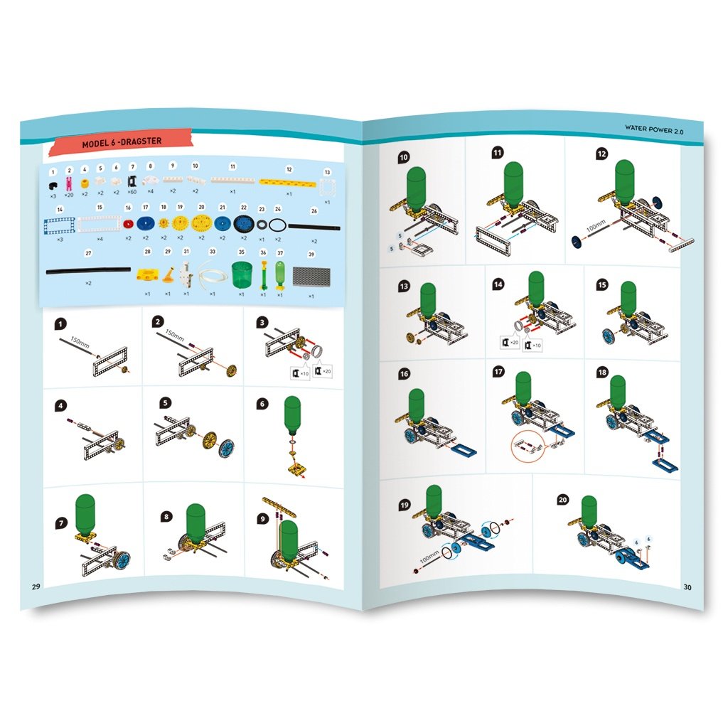 Kit STEM Construieste mecanisme propulsate cu apa Acest kit unic permite construirea a două sisteme diferite alimentate cu aer și apă: mașini propulsate cu jet de apă și motoare cu propulsie hidropneumatică. Sistemul hidropneumatic utilizează ca motor un sistem autonom de turbine cu aer și apă. Mașinile propulsate cu jet de apă sunt o activitate distractivă în aer liber, în timp ce modelele autonome cu motor hidropneumatic pot fi construite și experimentate atât în interior, cât și în exterior. Concurează cu prietenii tăi pentru a vedea al cui model ajunge cel mai departe! 15 modele propulsate de un motor hidropneumatic. ● Două sisteme diferite: * Primul sistem are 7 modele care prezintă sistemul acționat hidro-pneumatic. - Ideal atât pentru interior, cât și pentru exterior, deoarece apa este circulată și conținută în interior. * Sistemul doi are 8 modele care expun un sistem propulsat de jet de apă. - Ideal pentru exterior deoarece apa este pulverizată în exterior. ● Include piese speciale: rezervoare de apă, pompă securizată, duză, unitate de alimentare aer-apă. ● Un manual cu instrucțiuni ilustrate pas cu pas îți ghidează construcția de modele și experimentele. Piesele din aceast kit sunt compatibile cu piesele altor seturi de construcție Gigo Toys. Conține 165 de piese, 15 modele, manual cu instrucțiuni. Vărsta recomandată: +8 ani. Confecționat din plastic. Conform reglementarilor EN71&ASTM. AVERTISMENT: Contraindicat copiilor sub 3 ani, conține piese mici. Se recomandă supravegherea copilului de către un adult în timpul jocului. Citiți instrucțiunile înainte de utilizare, urmați-le și păstrați-le pentru referință. Produs in Taiwan de Genius Toy. Manual Kit STEM Construieste mecanisme propulsate cu apa, Gigo Toys - descarca aici fisierul