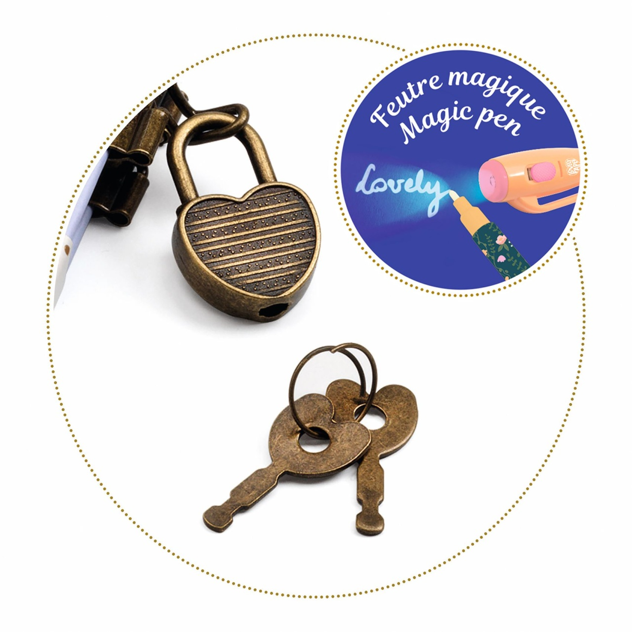 Un mic jurnal secret și un pix magic, cu cerneală invizibilă, pentru a păstra în siguranță toate secretele tale. Doar treci cu lumina UV din capacul pixului peste pagină și secretele sunt dezvăluite. Jurnalul conține 88 de pagini liniate și ilustrate. Este protejat de un lăcățel în formă de inimioară cu două chei. Lovely Paper de la Djeco este o colecție de papetărie rafinată, delicată și frumos ilustrată pentru a înveseli viața de zi cu zi a copiilor și adulților. Finisaj strălucitor cu detalii metalice. Conținut: jurnal secret (dimensiune 10 x 13,5 x 1 cm, hârtie de 120 g/m²) cu copertă cartonată imprimată, lăcățel cu 2 chei, pix magic cu buton Pornit/Oprit care funcționează cu 3 x baterii LR44 HD incluse. Vârsta recomandată: +8 ani. Fabricat din hârtie și carton certificat FSC®. Producător: Djeco, Franța.