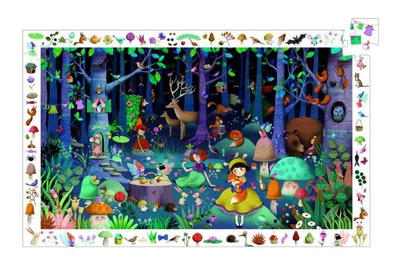 Puzzle observatie Padurea fermecata Pe măsură ce construiești puzzle-ul, observi alte și alte detalii amuzante și picante. Regăsește imaginile de pe margine după ce obții imaginea finală. Puzzle cu 100 piese. Dimensiune puzzle asamblat: 61 x 38 cm. Vârsta recomandată: +5 ani. Confecționat din carton, conform reglementărilor EN71&ASTM. AVERTISMENT: Contraindicat copiilor sub 3 ani! Poate conține piese mici, pericol de sufocare. Se recomandă supravegherea copilului de către un adult în timpul jocului. Producător: Djeco, Franța