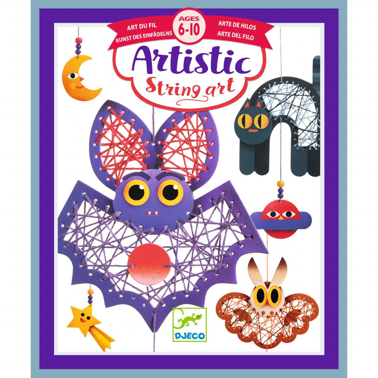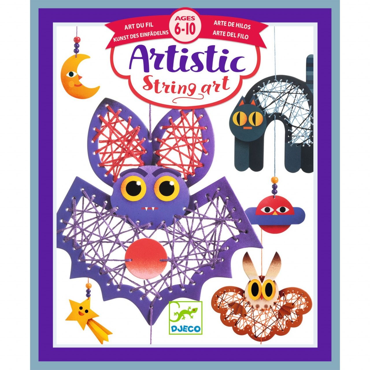 Set creativ de cusut Noaptea Un kit pentru a crea 3 modele decorative de agățat. Cu ajutorul acului cu vârf rotund, glisați șnurul prin cartonașele pre-perforate și încrucișați-l până când fiecare personaj are un corp. Finalizați creațiile adăugând pandantive cu mărgele de lemn. Contururi preperforate pentru a păstra activitatea simplă. Ac cu vârf rotund pentru a lucra în siguranță. Conține: 8 cartonașe preperforate, 5 mănunchiuri de ață, ac, înfiletător de ace, 9 mărgele din lemn, broșură cu instrucțiuni pas cu pas. Vârsta recomandată: 6 - 10 ani. Fabricat din hârtie și carton certificate FSC®. Conform reglementărilor EN71&ASTM. AVERTISMENT: Contraindicat copiilor sub 3 ani, conține piese mici, pericol de înghițire. Conține ac, pericol de rănire. A se utiliza sub directa supraveghere a unui adult. Producător: Djeco, Franța