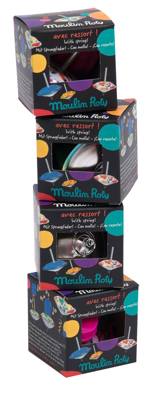Titirez metalic cu arc Datorită arcului integrat, titirezul se învârte și sare în același timp! Montați capacul colorat pe partea superioară a rotiței, apoi introduceți delicat pârghia metalică într-una dintre cele 3 crestături speciale, rotiți capacul spre dreapta de 3-4 ori, eliberați rotița la aproximativ 10-15 cm de o suprafață plană apăsând pe vârf. Pregătiți-vă să fiți uimiți! Dimensiuni : 4.5 x 6 cm Vârsta recomandată: +3 ani. Confecționat din metal și plastic, conform reglementărilor EN71&ASTM. AVERTISMENT: Contraindicat copiilor mai mici de 3 ani. A se utiliza sub directa supraveghere a unei persoane adulte. Producător Moulin Roty, Franța.