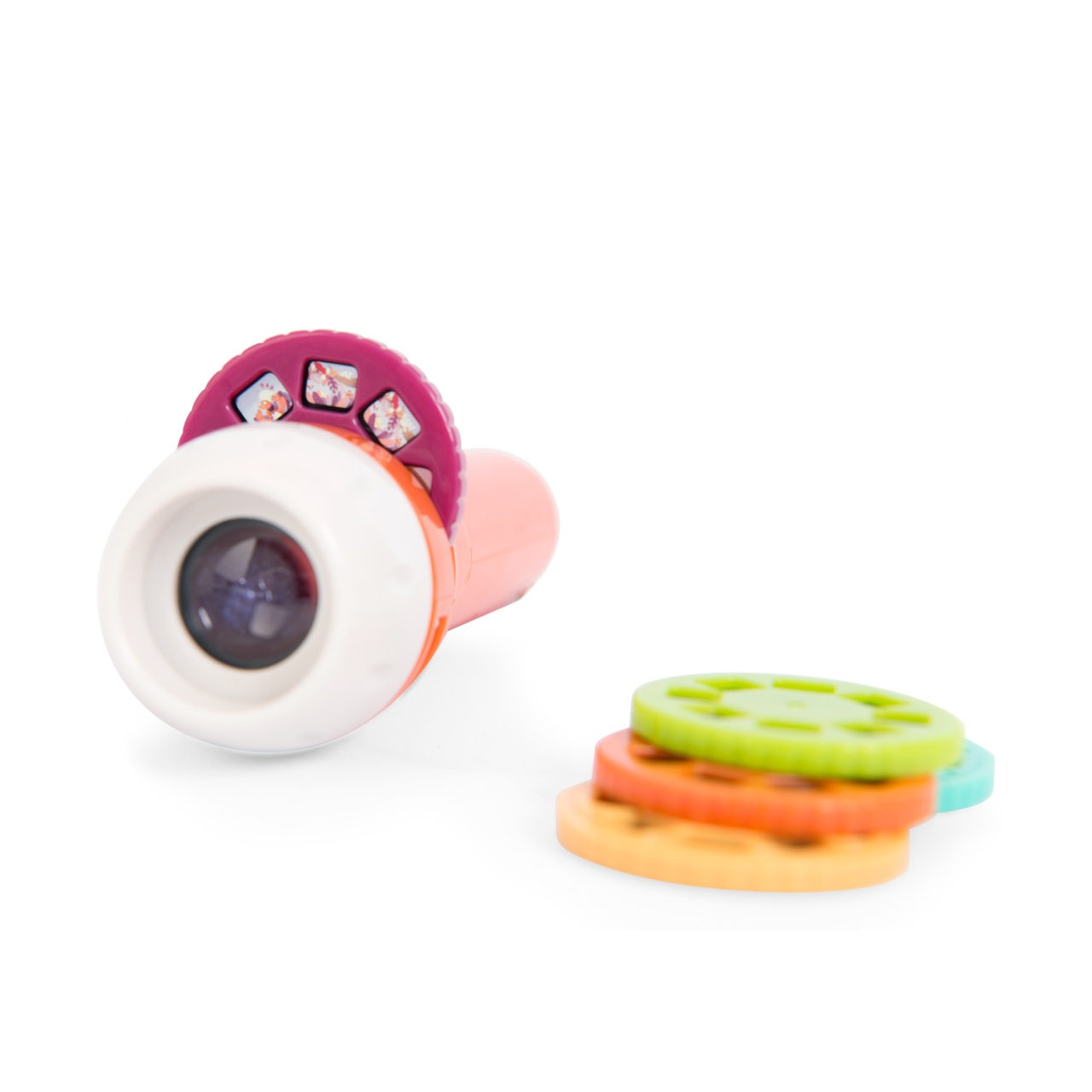 Cutie cu lanterna de proiectat povesti In jungla Cutie magnetică, concepută ca o carte, care conține o lanternă de proiecție cu 5 discuri cu povești diferite și 5 invitații la spectacole, sub forma unor mini-plicuri cu mesaje secrete. Organizați o sesiune de povești și trimiteți invitații prietenilor! Lanterna proiectează imagini color pentru a spune povești inedite, fără cuvinte, auditoriului său. Un moment magic pentru a petrece timpul împreună cu cei dragi și a îmbogăți imaginația copiilor. Introduceți discul ales în fanta lămpii, apasați butonul de pornire, focalizați și proiectați imaginea pe perete sau tavan, apoi rotiți discul pentru a proiecta următoarele imagini. Lampa proiectează imagini pe o distanță de până la 90 cm. Funcționează cu 3 baterii incluse (1,5 V AG13/LR44). Vârsta recomandată: 4 - 7 ani. Material: plastic ABS. Se curăță cu o cârpă moale și umedă. Producător Moulin Roty, Franța.