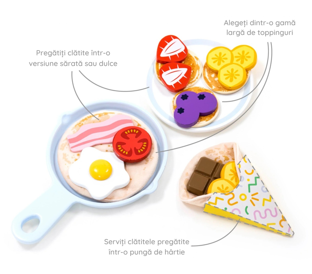 Joc de rol Set de preparat clătite, UMU Toys Un set complet pentru micii maeștri ai clătitelor! Acest joc de rol îi ajută pe copii să-și dezvolte imaginația și abilitățile motorii fine în timp ce pregătesc clătite dulci sau sărate. De la amestecarea aluatului până la servirea clătitei în punga decorativă, fiecare pas este o ocazie de joacă educativă. Copiii pot alege dintre o mulțime de toppinguri colorate – ou, banană, roșii, bacon, afine, ciocolată sau gem – și pot crea combinații originale. Gătitul devine astfel un exercițiu de creativitate și autonomie. Cine comandă azi clătite cu afine și ou prăjit? Setul include ustensile realiste precum tel, spatulă și tigaie, dar și ingrediente de jucărie fabricate cu grijă, pentru a imita perfect o experiență autentică. Învățarea prin joc devine savuroasă, iar copilul va înțelege ce înseamnă planificarea, împărțirea porțiilor și bucuria de a împărți cu ceilalți. Ideal pentru jocuri de familie, pentru socializare și învățare prin colaborare. Copiii își pot deschide propria crêperie imaginară, pot lua comenzi, pregăti porții și servi clienții. 🎁 Cadoul perfect pentru zile de naștere, Crăciun sau alte ocazii speciale. Setul conține 40 de piese: tigaie, ustensile, clătite moi din material textil, mini-clătite, ingrediente și toppinguri diverse (ou, afine, roșii, banane, bacon, ciocolată, gem), bol, platou, farfurie, pahar, cutie cu făină, meniu decorativ crêperie, punga pentru servire, sticlă de lapte și multe altele – toate cu margini netede și sigure pentru copii. Vârsta recomandată: +3 ani 🌱 Confecționat din lemn și textile cu vopsele ecologice pe bază de apă. Conform EN71 & ASTM, cu certificare CE AVERTISMENT: Contraindicat copiilor sub 3 ani. Se recomandă supravegherea copilului în timpul jocului. Produs în China pentru UMU Toys, Cehia.