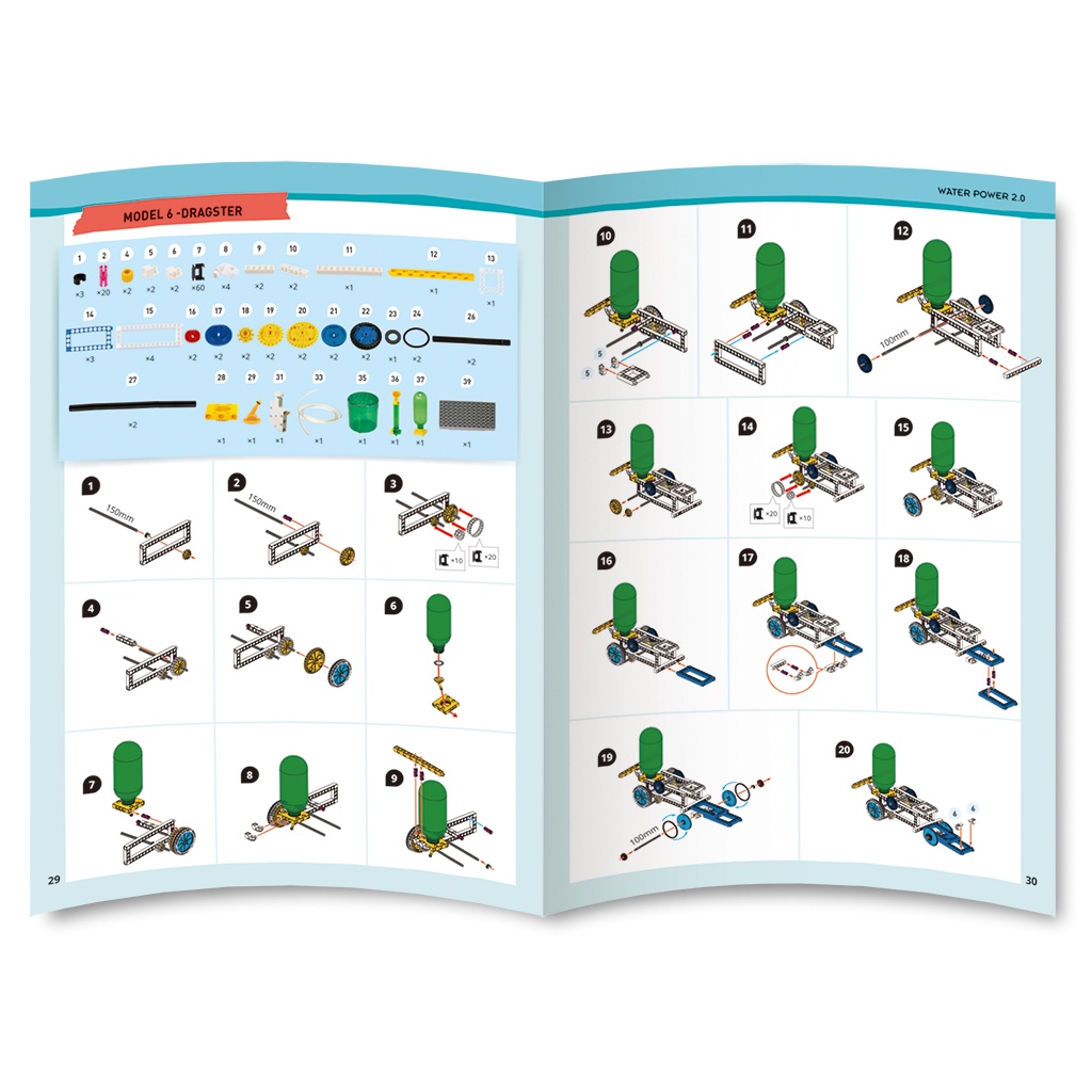 Kit STEM Construieste mecanisme propulsate cu apa Acest kit unic permite construirea a două sisteme diferite alimentate cu aer și apă: mașini propulsate cu jet de apă și motoare cu propulsie hidropneumatică. Sistemul hidropneumatic utilizează ca motor un sistem autonom de turbine cu aer și apă. Mașinile propulsate cu jet de apă sunt o activitate distractivă în aer liber, în timp ce modelele autonome cu motor hidropneumatic pot fi construite și experimentate atât în interior, cât și în exterior. Concurează cu prietenii tăi pentru a vedea al cui model ajunge cel mai departe! 15 modele propulsate de un motor hidropneumatic. ● Două sisteme diferite: * Primul sistem are 7 modele care prezintă sistemul acționat hidro-pneumatic. - Ideal atât pentru interior, cât și pentru exterior, deoarece apa este circulată și conținută în interior. * Sistemul doi are 8 modele care expun un sistem propulsat de jet de apă. - Ideal pentru exterior deoarece apa este pulverizată în exterior. ● Include piese speciale: rezervoare de apă, pompă securizată, duză, unitate de alimentare aer-apă. ● Un manual cu instrucțiuni ilustrate pas cu pas îți ghidează construcția de modele și experimentele. Piesele din aceast kit sunt compatibile cu piesele altor seturi de construcție Gigo Toys. Conține 165 de piese, 15 modele, manual cu instrucțiuni. Vărsta recomandată: +8 ani. Confecționat din plastic. Conform reglementarilor EN71&ASTM. AVERTISMENT: Contraindicat copiilor sub 3 ani, conține piese mici. Se recomandă supravegherea copilului de către un adult în timpul jocului. Citiți instrucțiunile înainte de utilizare, urmați-le și păstrați-le pentru referință. Produs in Taiwan de Genius Toy. Manual Kit STEM Construieste mecanisme propulsate cu apa, Gigo Toys - descarca aici fisierul