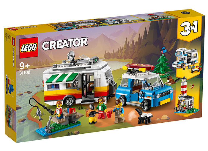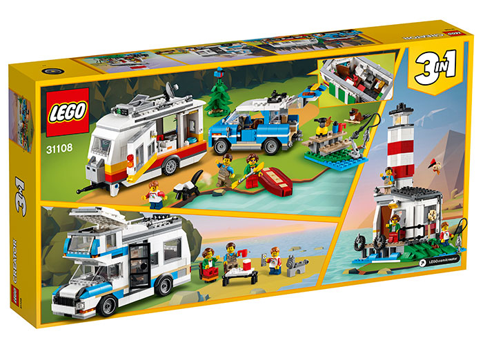 Impacheteaza-ti echipamentul de camping, e timpul de vacanta! Prinde rulota de masina retro super, si pleaca in natura pentru o vacanta in familie. Cand gasesti locul potrivit, instaleaza-te, apoi pleaca sa prinzi un peste pentru cina. Oooh, uita ce animalut simpa... o, nu, un SCONCS! Dupa sperietura mirositoare, reconstruieste rulota si masina intr-o furgoneta de camping, sau un far rosu-alb. Vacantele in natura sunt o placere cu acest set minunat 3 in 1!