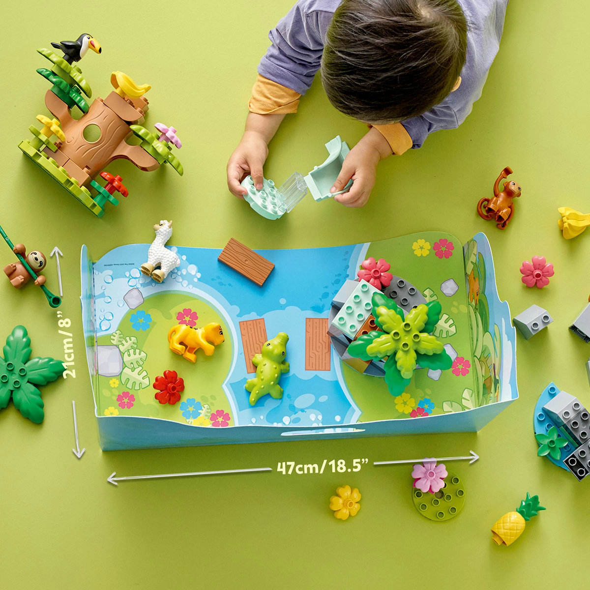 Descoperă fauna sălbatică şi mediul natural ale Americii de Sud alături de micuţul tău. Acest set interactiv adaptabil oferă nenumărate posibilităţi de joc şi învăţare. Cunoaşte un crocodil, maimuţe, un leneş, un pui de jaguar, un tucan şi o alpaca; explorează copacii, pietrele şi o cascadă; reconfigurează apoi setul pentru noi aventuri pe covoraşul tridimensional, pliabil, cu tema junglei.