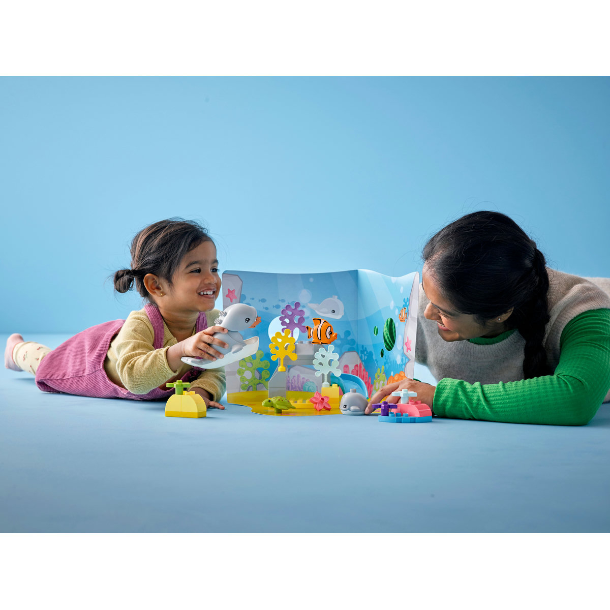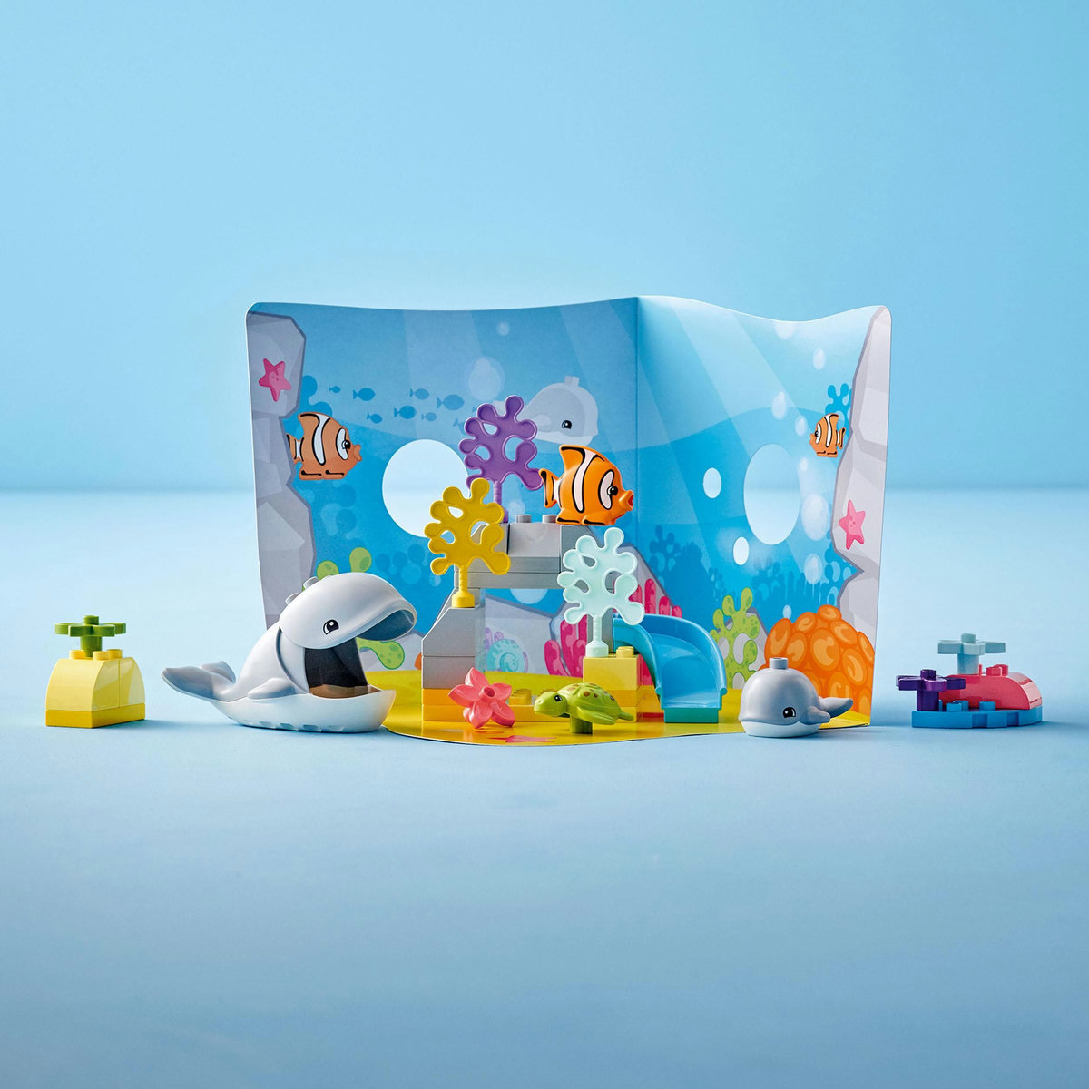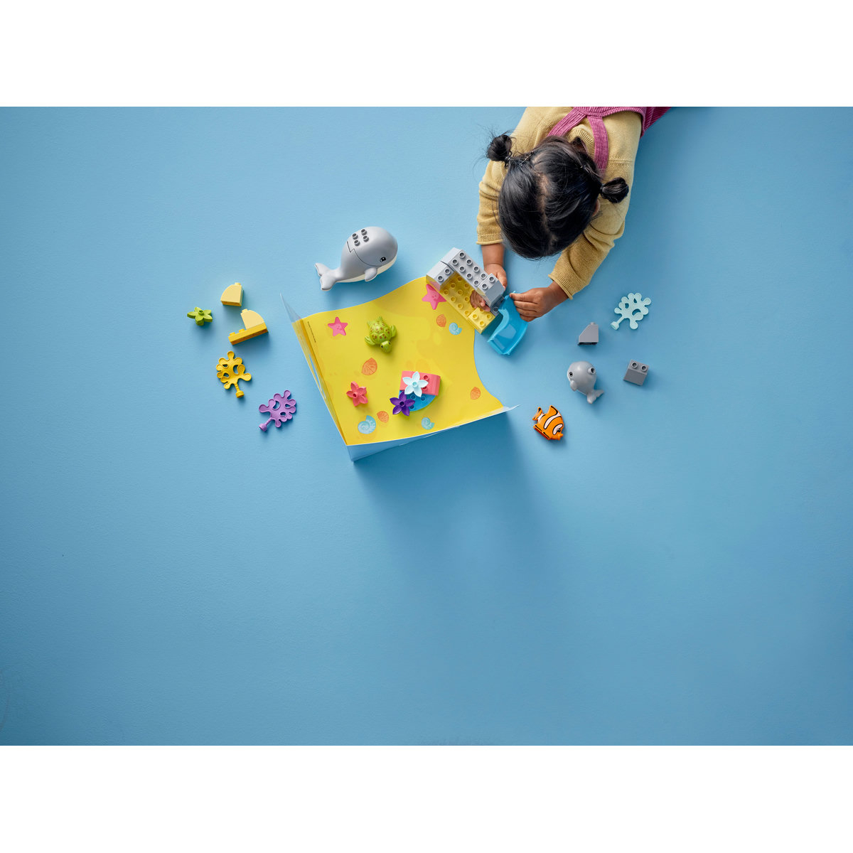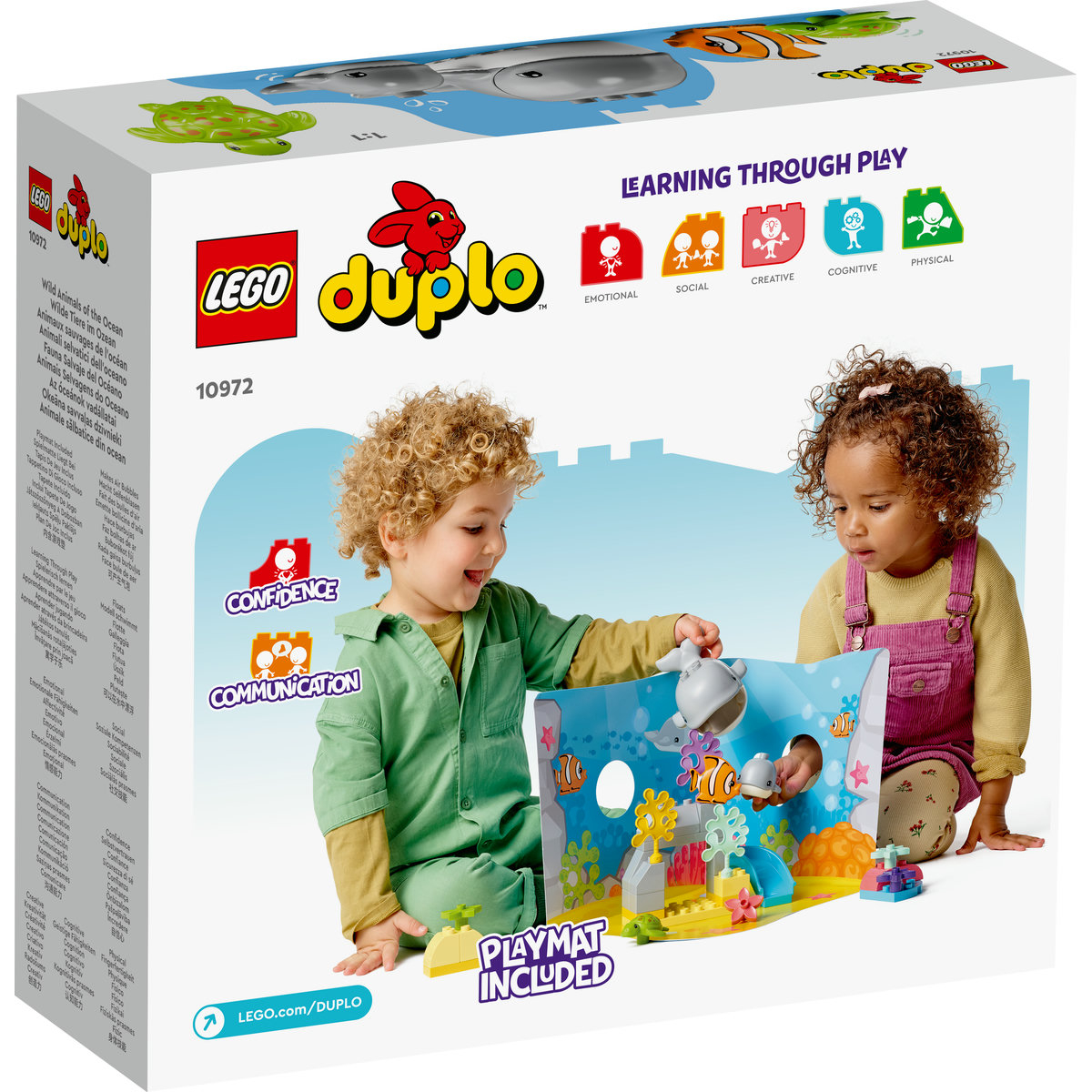Porneşte alături de micuţii iubitori de animale într-o călătorie a imaginaţiei către fundul oceanului cu setul LEGO® DUPLO® Animale sălbatice din ocean (10972) pentru copii de doi ani şi mai mari.