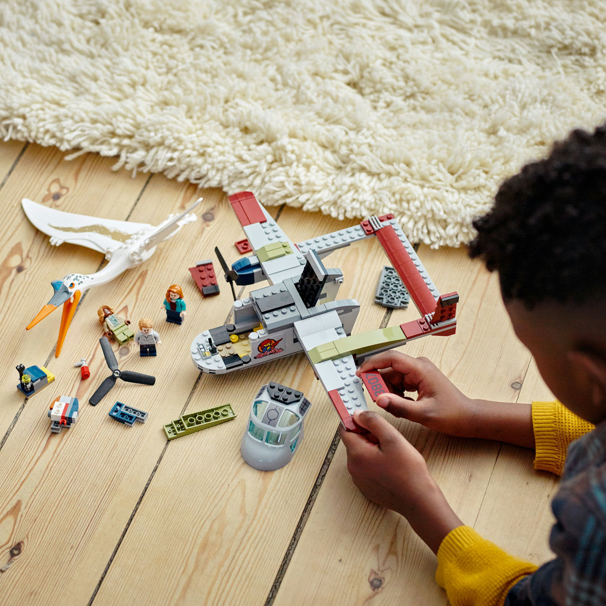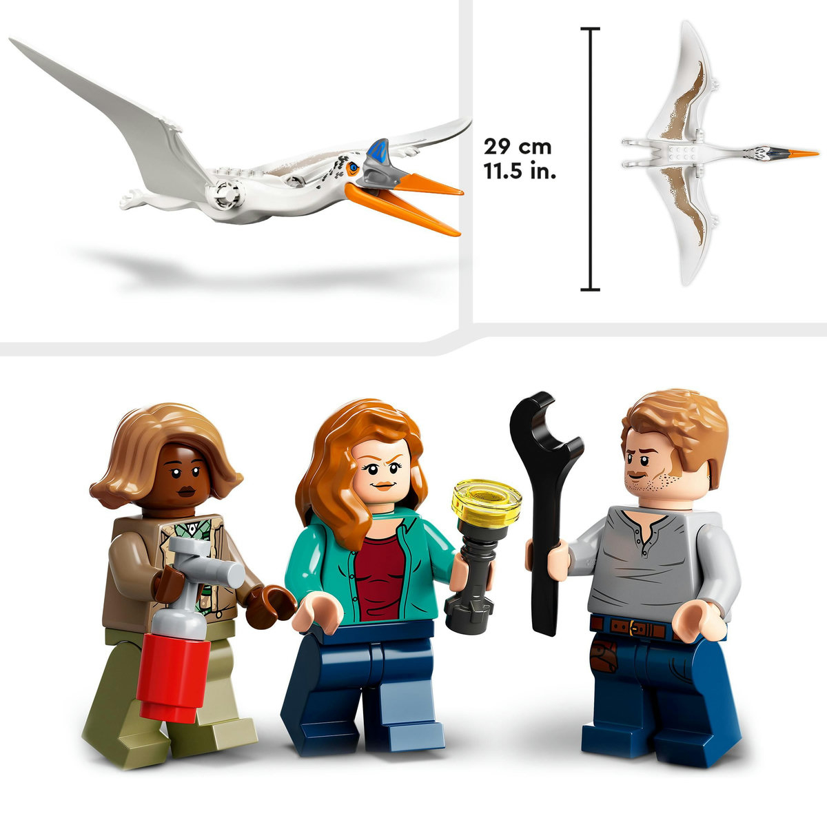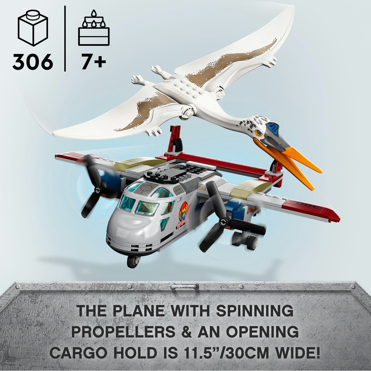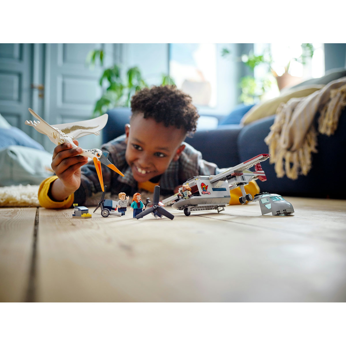 Retrăieţte aciunea palpitantă de zbor din filmul Jurassic World+u00a0Dominion cu acest set de joc Ambuscada avionului de către Quetzalcoatlus (76947) pentru copiii de 7+ ani pasionai de dinozauri. Include un avion cu loc în carlingă pentru 3 minifigurine, elice care se învârte, cală care se deschide ţi motoare care se desprind în urma atacului figurinei poziionabile Quetzalcoatlus (motoarele se ataţează din nou cu uţurină).