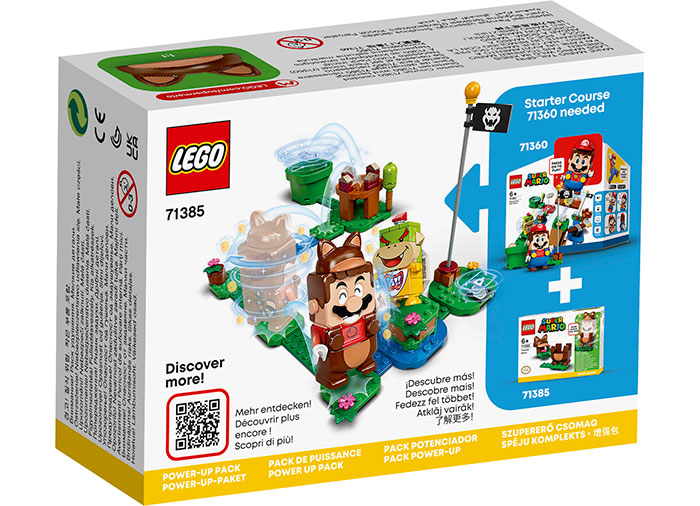 Deschide noi posibilitati pentru jucatorii LEGO Super Mario cu acest Costum de puteri Mario Tanooki (71385), ce consta dintr-un costum interactiv pentru LEGO Mario (figurina nu este inclusa). Cand LEGO Mario poarta costumul, jucatorii pot castiga monede digitale suplimentare invartindu-l inainte de a calca cu putere pe inamici. Acest set este o jucarie cadou distractiva pentru copiii creativi care au deja Setul de baza Aventuri cu Mario (71360) ce include figurina LEGO Mario. Aplicatie distractiva Exista instructiuni de constructie ilustrate in cutie si in aplicatia gratuita LEGO Super Mario. Aplicatia ofera de asemenea o platforma unde copiii pot impartasi idei in siguranta, inspiratie pentru moduri de joaca si constructie, plus alte elemente distractive. LEGO Mario nelimitat Seturile de joc de colectie LEGO Super Mario aduc un personaj emblematic Nintendo in lumea reala si incurajeaza creativitatea copiilor in rezolvarea de probleme. Setul de baza, Seturile de extindere si Costumele de puteri permit fanilor sa construiasca niveluri nelimitate pentru competitii cu prietenii si familia sau provocari pentru un singur jucator.