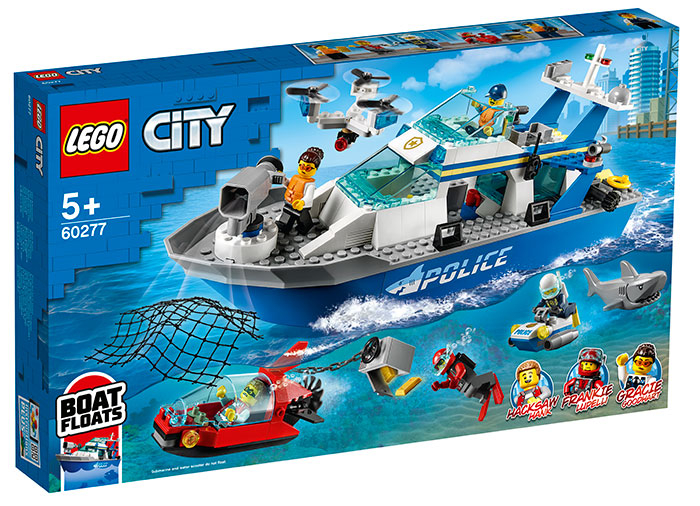 Aceasta jucarie plutitoare Nava de patrulare a politiei LEGO City (60277) este plina de dotari impresionante, inclusiv un post de control detaliat si drona de supraveghere. Copiii pot apasa o maneta pentru a elibera scafandrul si scuterul de scafandru si pot trage cu lansatorul de plasa pentru a prinde mini submarinul escrocilor. Cu 5 minifigurine la bord, inclusiv Gracie Goodhart, Frankie Lupelli si Hacksaw Hank din serialul TV Aventuri in LEGO City, ai inspiratie din plin pentru joaca pe roluri creativa. Distractiv si usor de construit Include un ghid de constructie usor de urmat si Instructions PLUS - parte a aplicatiei gratuite Instructiuni de constructie LEGO pentru smartphone-uri si tablete. Acest ghid de constructie interactiv, cu instrumente de vizualizare cu zoom si rotire ajuta rapid constructorii LEGO in devenire sa devina maestri constructori! Jucarii cool pentru copii Seturile de politie LEGO City ofera scenarii captivante de joaca ce reproduc viata reala intr-un mod distractiv si imaginativ, cu vehicule realiste si personaje pline de inspiratie pe care copiii le vor adora.