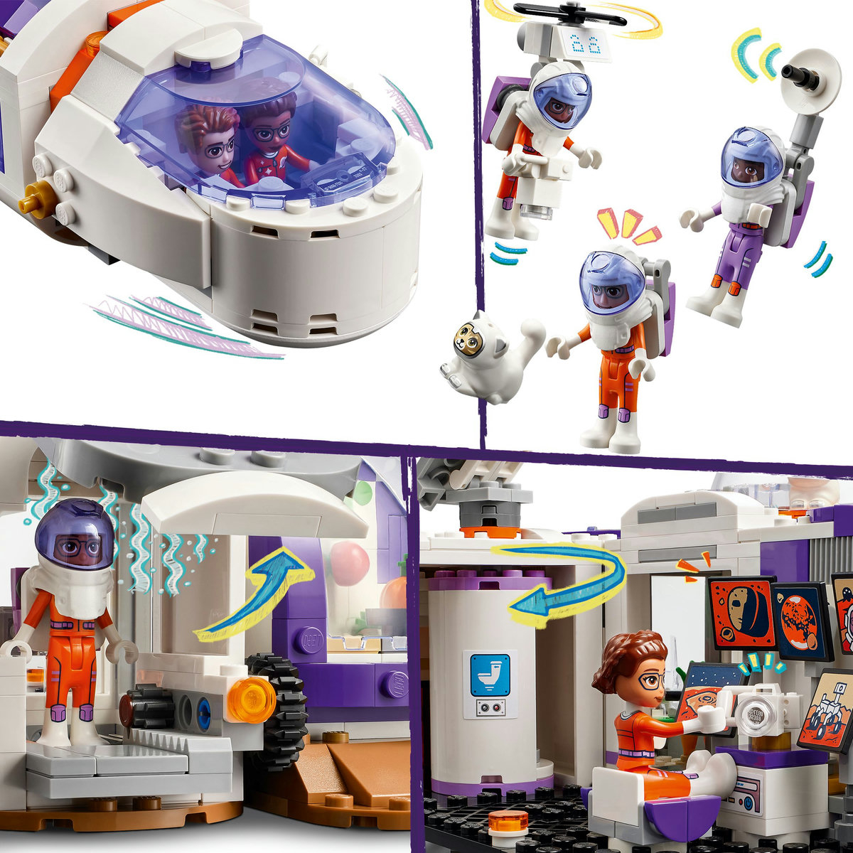 Inspiră micii exploratori să înveţe despre spaţiul cosmic cu jucăria LEGO® Friends Bază spaţială şi rachetă pe Marte (42605), concepută pentru copii, fete şi băieţi de 8+ ani. Kitul de construcţie include 3 minipăpuşi şi o figurină pisică, plus o rachetă, un rover de explorare, o bază de cercetare modulară şi accesorii ştiinţifice.