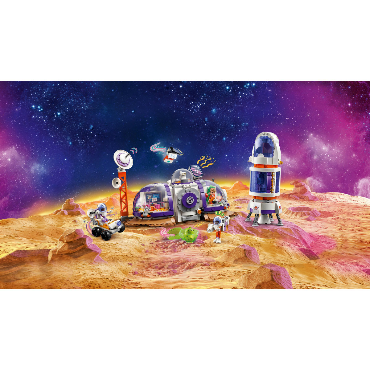 Acest kit de construcţie poate fi un cadou de zi de naştere atractiv pentru micii călători în spaţiu care sunt pasionaţi de ştiinţă şi tehnologie. Copiii îşi pot imagina viaţa pe Marte pe măsură ce construiesc racheta şi transportă personajele la baza de cercetare. Designul modular le oferă copiilor posibilitatea să rearanjeze diferitele capsule pentru a personaliza construcţia. Capsulele includ spaţii diferite pentru cercetare ştiinţifică, comunicare, cultivarea alimentelor şi relaxare. Setul conţine o mulţime de accesorii şi detalii pentru a alimenta joaca pe roluri, între care un rover, o dronă şi instrumente ştiinţifice.