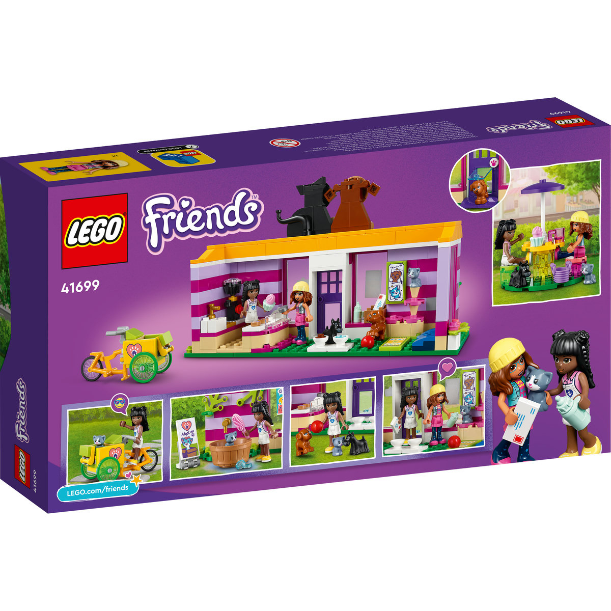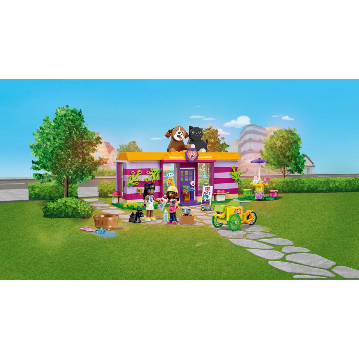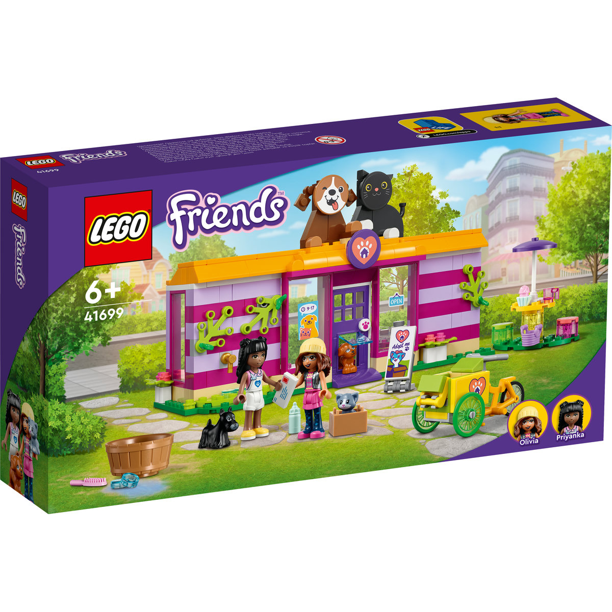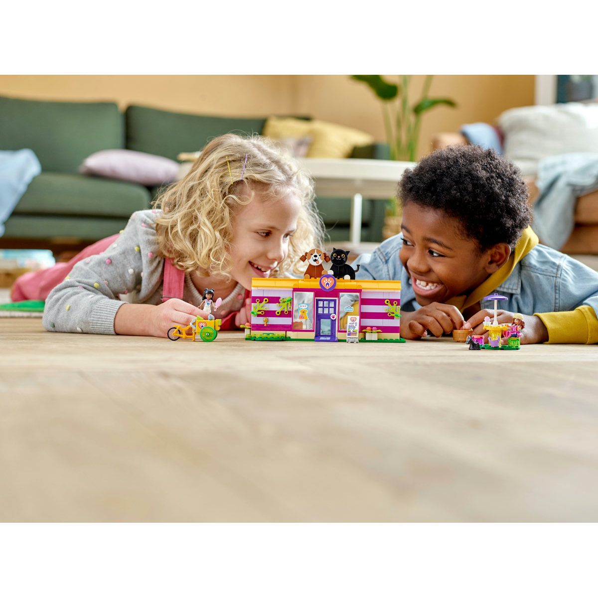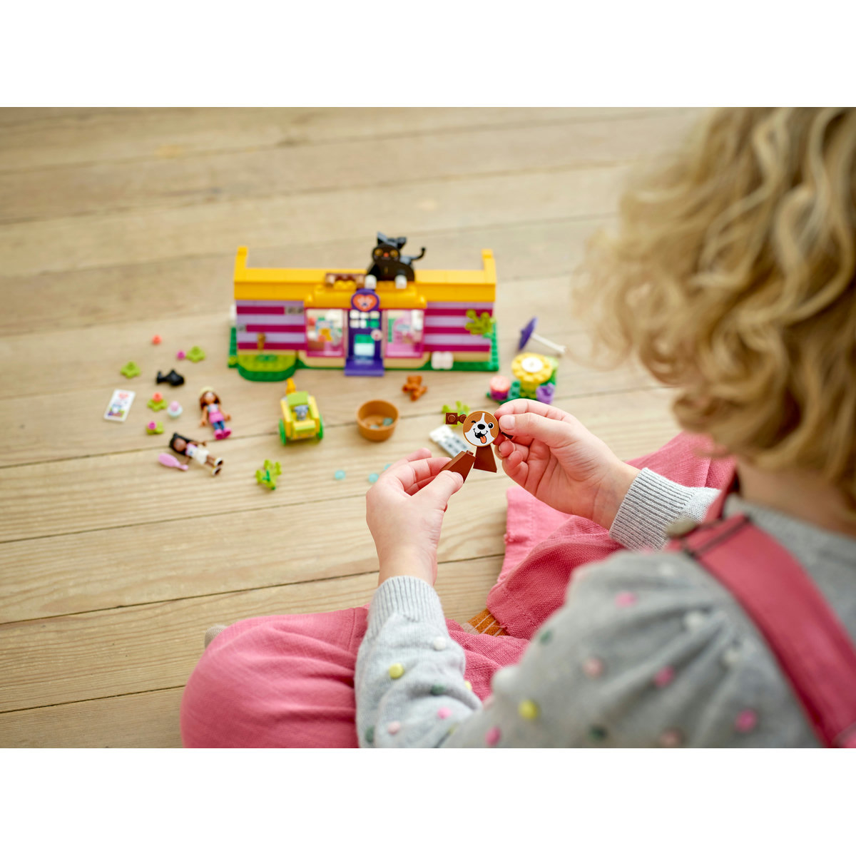 Acest set de joc creativ va stimula imaginaţia copiilor pentru a oferi ore întregi de poveşti distractive. Include o cafenea şi o zonă cu scaune în aer liber unde personajele LEGO Friends pot crea legături afective cu animalele, plus o zonă de recepţie primitoare. Copiii pot merge cu tricicleta de salvare prin oraş pentru a căuta animale abandonate sau pot antrena animalele în sala de sport. Setul are chiar şi o uşă simpatică prin care animalele pot trece oricând doresc!