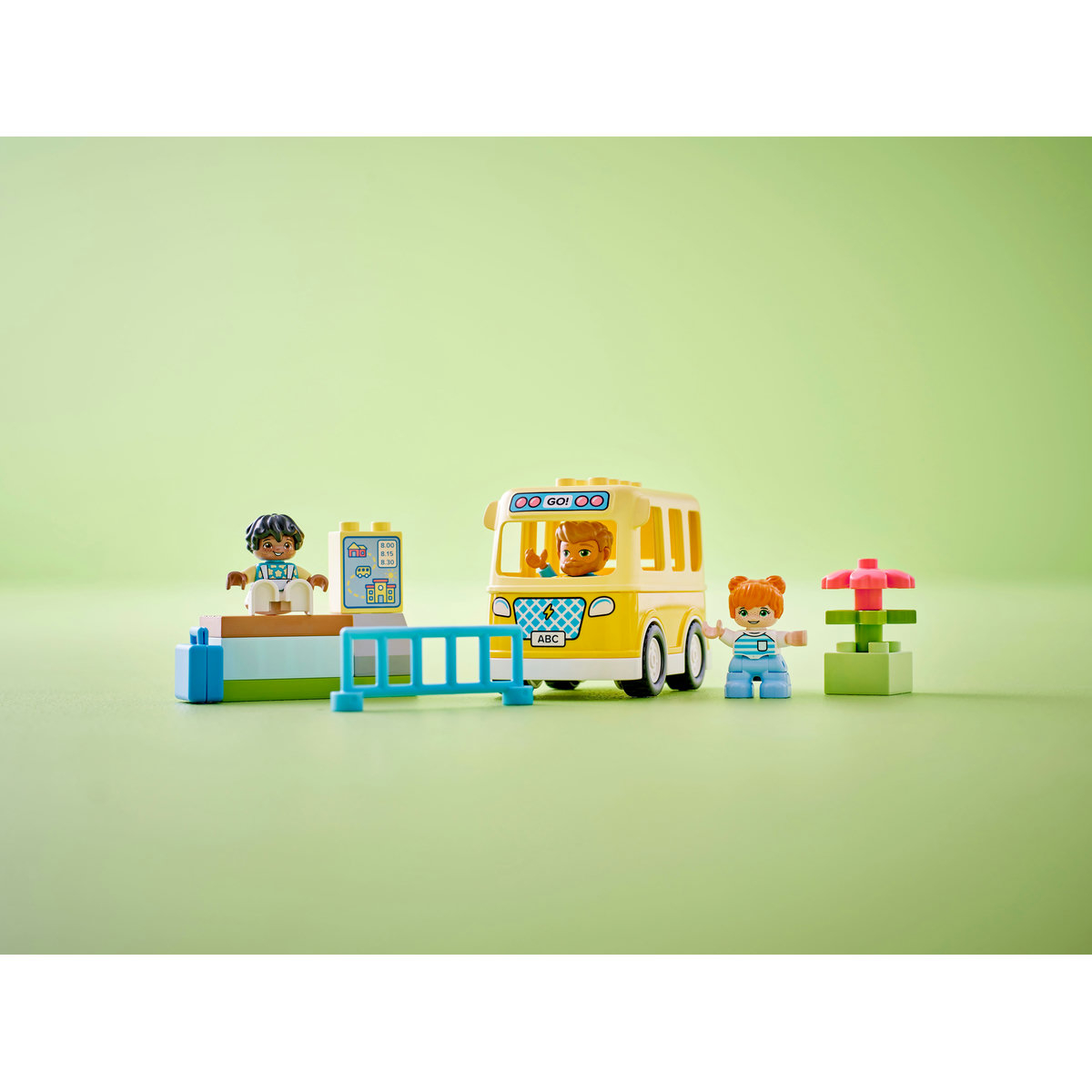 Seturile LEGO DUPLO conţinpersonaje diverse astfel încât cei mici să-ţi imagineze că-ţi fac prieteni noi. Ei dezvoltă abilităţi motorii fine pe când deschid acoperiţul autobuzului ţcolar ţi aţază figurinele înăuntru. Figurinele stau dincolo de gard atunci când autobuzul opreţte în staţie, pentru ca preţcolarii să înveţe cum să se comporte în trafic. Asemenea celorlalte jucării LEGO DUPLO, ţi acest set plasează distracţia fără restricţii, exprimarea de sine ţi explorarea veselă în mâinile copiilor mici.