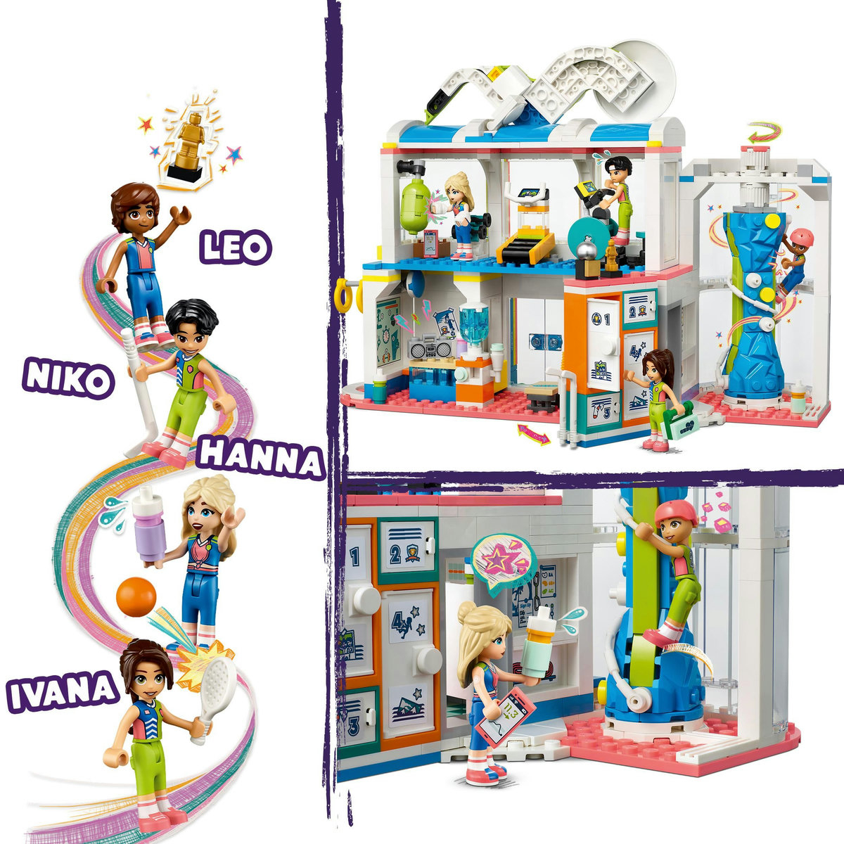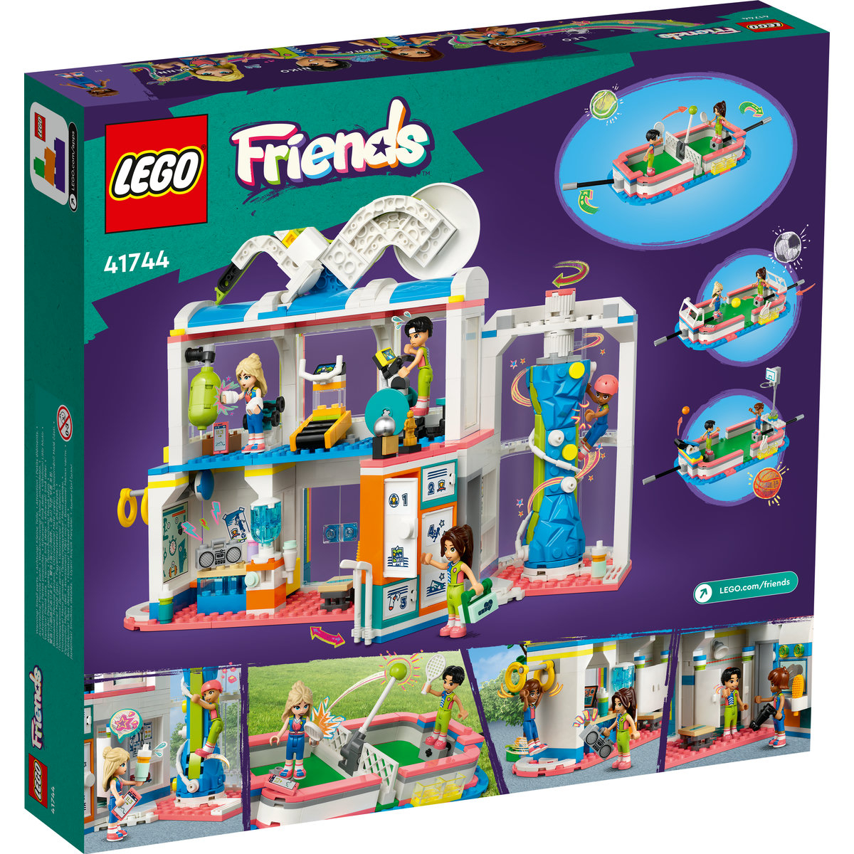 Oferă o bucurie copiilor pasionaţi de sport de 8 ani şi mai mari cu jucăria LEGO® Friends Centru sportiv (41744). Setul are 4 minipăpuşi şi o mulţime de accesorii. Include 1 câmp care poate fi modificat prin schimbarea porţilor şi plaselor pentru diferite sporturi. Setul mai include şi suporturi pentru minipăpuşi şi diferite mingi, astfel încât copiii să dacă personajele să joace de-adevăratelea. După antrenamentul de fotbal, schimbă porţile cu un fileu de tenis şi lansează mingi deasupra lui. Apoi treci la un coş de baschet şi învaţă cum să înscrii coşuri. Există şi o tabelă de marcaj şi un loc unde să păstrezi mingile în siguranţă. În interiorul clădirii centrului sportiv, copiii pot explora sala de fitness, peretele de escaladă şi vestiarul.
