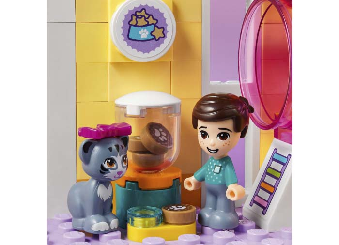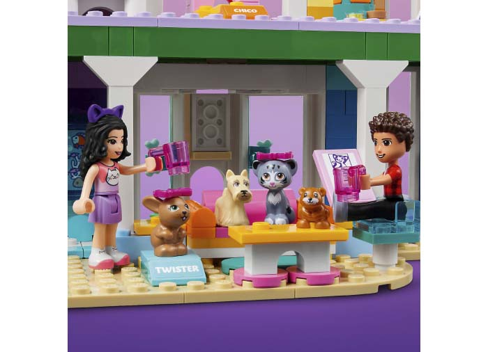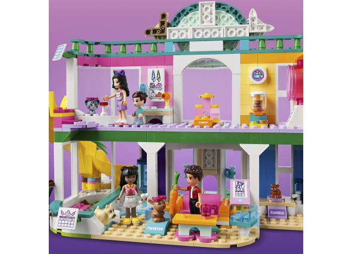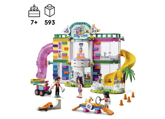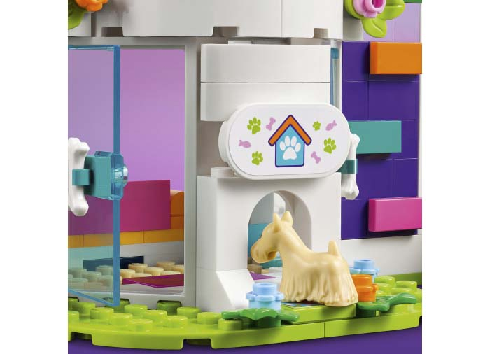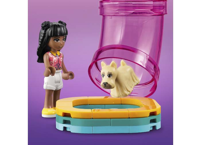 Începând cu uşile din faţă +u2013 una pentru mini-păpuşi şi cealaltă pentru animale +u2013 copiii vor adora să exploreze toate elementele acestui cadou LEGO® Friends. Ei se vor distra învăţând câinele să execute trucuri noi, ducându-l în cursa de agilitate şi învăţându-l să meargă pe skateboard. Drept recompensă, animalele pot coborî pe un tobogan colorat şi se pot răcori în piscină.