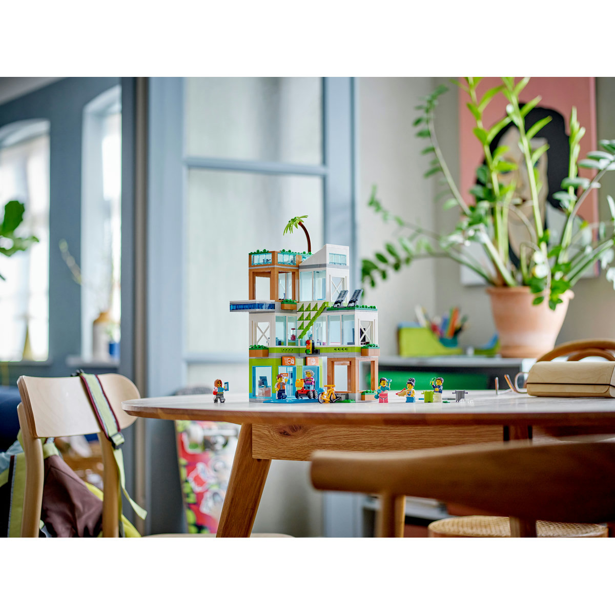 Acest set 6+ LEGO® City Bloc de apartamente (60365) de calitate superioară conţine module de camere combinabile, cu o mulţime de detalii la interior pentru joacă fantezistă, incluzând un magazin, living, bucătărie, dormitor şi o baie complet echipată cu toaletă şi cadă. Setul mai include şi un scuter de mobilitate, o bicicletă, 6 minifigurine şi o Placă de drum LEGO pentru conectarea cu alte seturi din gama LEGO City.