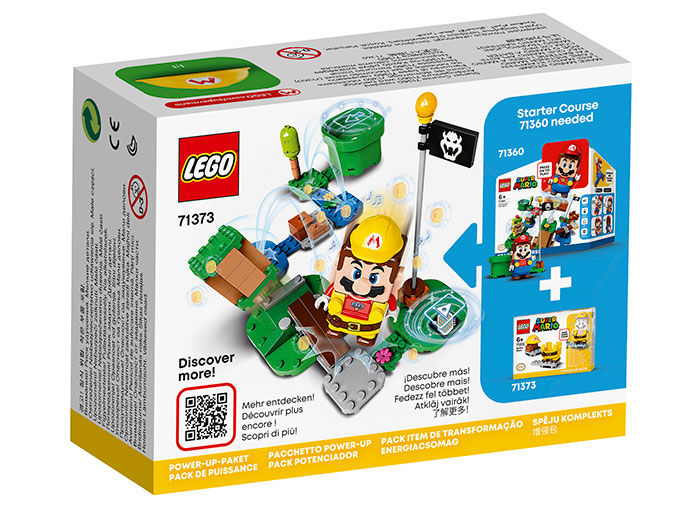Jucatorii LEGO® Super Mario™ î?i pot depa?i scorul record cu acest Costum de puteri: Constructor (71373). Cand LEGO Mario poarta acest costum interactiv, jucatorul poate câ?tiga monede digitale, facându-l pe Mario sa sara pe traseul din caramizi. Acest set de construc?ie reprezinta un cadou de jucarie excelent pentru copiii care au setul de baza Aventurile lui Mario (71373), unde se gase?te figurina LEGO Mario.