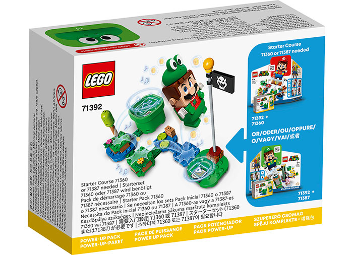 Fanii pot adăuga distracţie cu salturi şi stropi la experienţa lor de joacă LEGO® Super Mario™, cu acest Pachet de puteri suplimentare Mario Broască (71392). Constă dintr-un costum interactiv de broască pentru LEGO® Mario™ (figurina nu este inclusă), care oferă jucătorului şansa de a câştiga monede digitale suplimentare făcându-l să sară şi declanşând sunete de stropire de fiecare dată când aterizează. Acest set este un cadou ideal pentru copiii cu spirit de iniţiativă care deţin Setul de bază LEGO Super Mario 71360 ce-l include pe LEGO Mario sau setul 71387 care include o figurină LEGO® Luigi™.