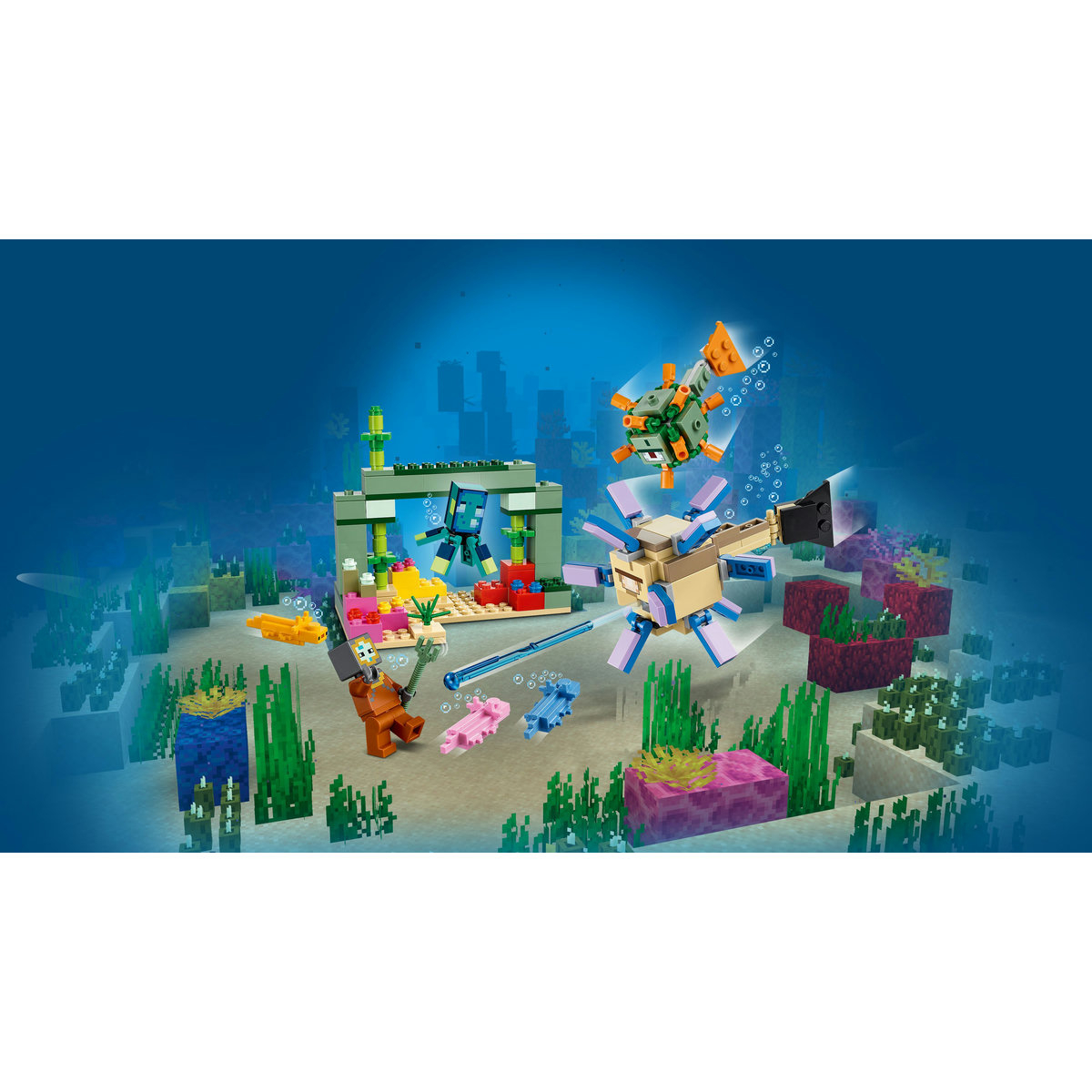 Ia-ţi costumul de scafandru, sari în oceanul Minecraft® şi construieşte un monument subacvatic. În reciful de corali există o comoară ascunsă. Dar când trec înot un păzitor şi un păzitor senior, trebuie să-ţi foloseşti tridentul şi pe cei 3 axolotli îmblânziţi pentru a respinge atacurile mobilor ostili. Păzitorul senior îşi smuceşte coada pentru a lansa o rachetă laser. Vei reuşi să explorezi monumentul - sau te vor împiedica păzitorii!