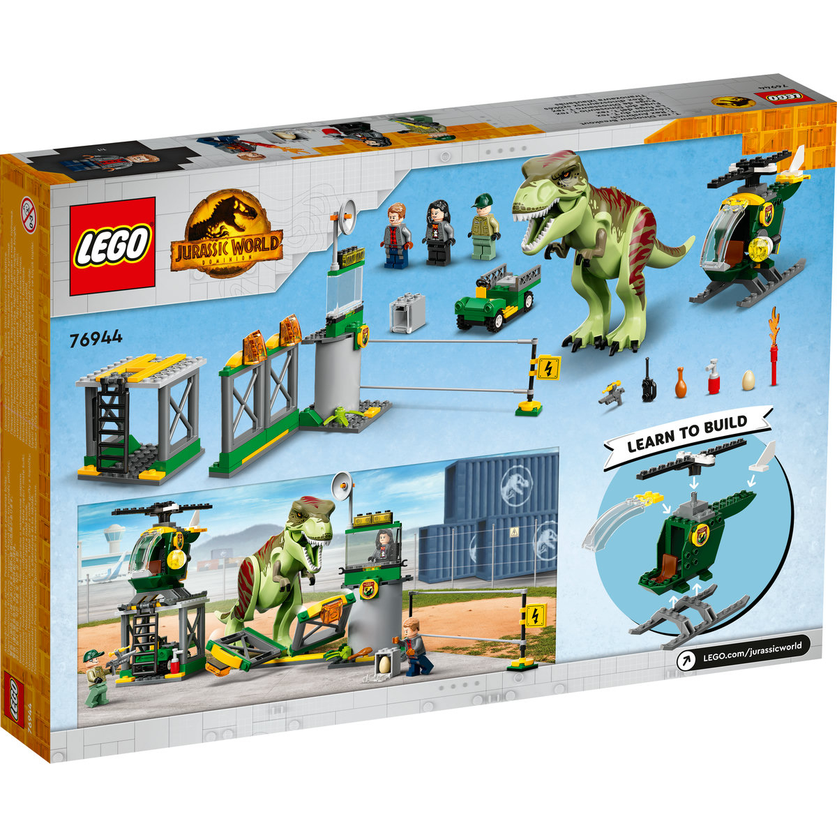Copiii care iubesc dinozaurii ţi vehiculele cool se vor bucura să învee să construiască cu acest set de joc LEGO® Jurassic World Evadarea dinozaurului T. rex (76944) pentru copii de 4 ani ţi mai mari. Include un aeroport cu un heliport, garaj, elicopter, buggy ţi un gard pliant, plus o figurină T. rex poziionabilă. În plus, mai sunt 3 minifigurine +u2013 Owen Grady, Zia Rodriguez ţi un paznic al faunei sălbatice +u2013 cu accesorii precum un ou de dinozaur ţi walkie-talkie pentru a inspira joaca imaginativă.