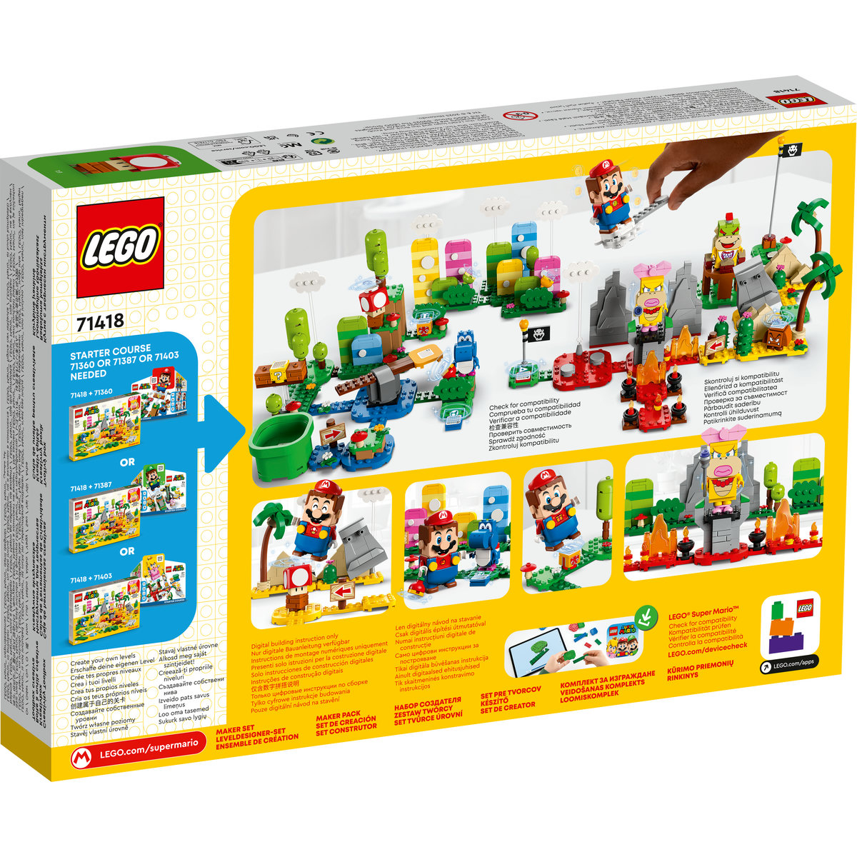 Micii constructori pot adăuga detalii suplimentare şi profunzime nivelurilor lor LEGO® Super Mario™ cu acest Set de creator Cutia de unelte pentru creativitate (71418). Setul include elemente construibile precum copaci, flori, munţi, ciuperci, piramide, un steag de punct de control şi altele pentru a recrea aspectul nivelurilor Super Mario™ de iarbă, deşert şi lavă. De asemenea, în set se găsesc 3 fructe, o cutie cadou şi o Super Mushroom cu o Etichetă de acţiune şi 3 personaje LEGO Super Mario:Wendy, Yoshi albastru şi un Goomba. Acest set este un cadou grozav pentru copiii de 6 ani şi mai mari care deţin un Set de bază (71360, 71387 sau 71403), necesar pentru joaca interactivă.